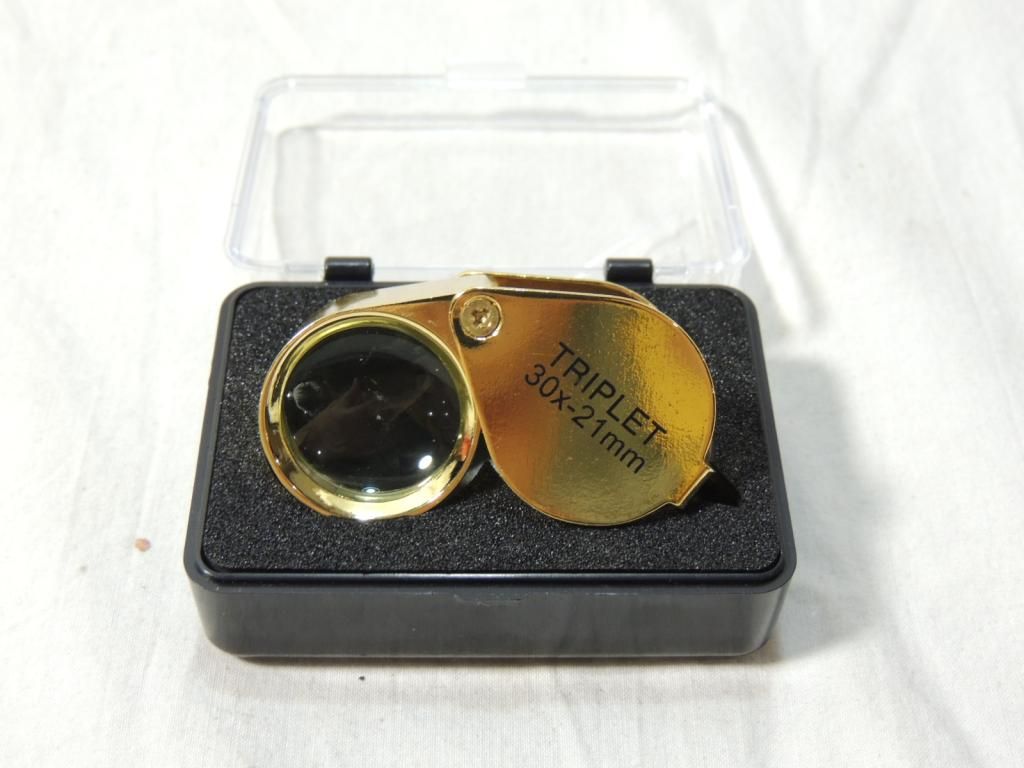 30x 21MM TRIPLET JEWELERS LOUPE WITH CASE. PROTABLE MINI 30X21MM TRIPLET JEWELERY LOUPE FOR JEWELRY TOOL EQUIPMENT. AS SHOWN. SEE PHOTO FOR MORE DETAILS.