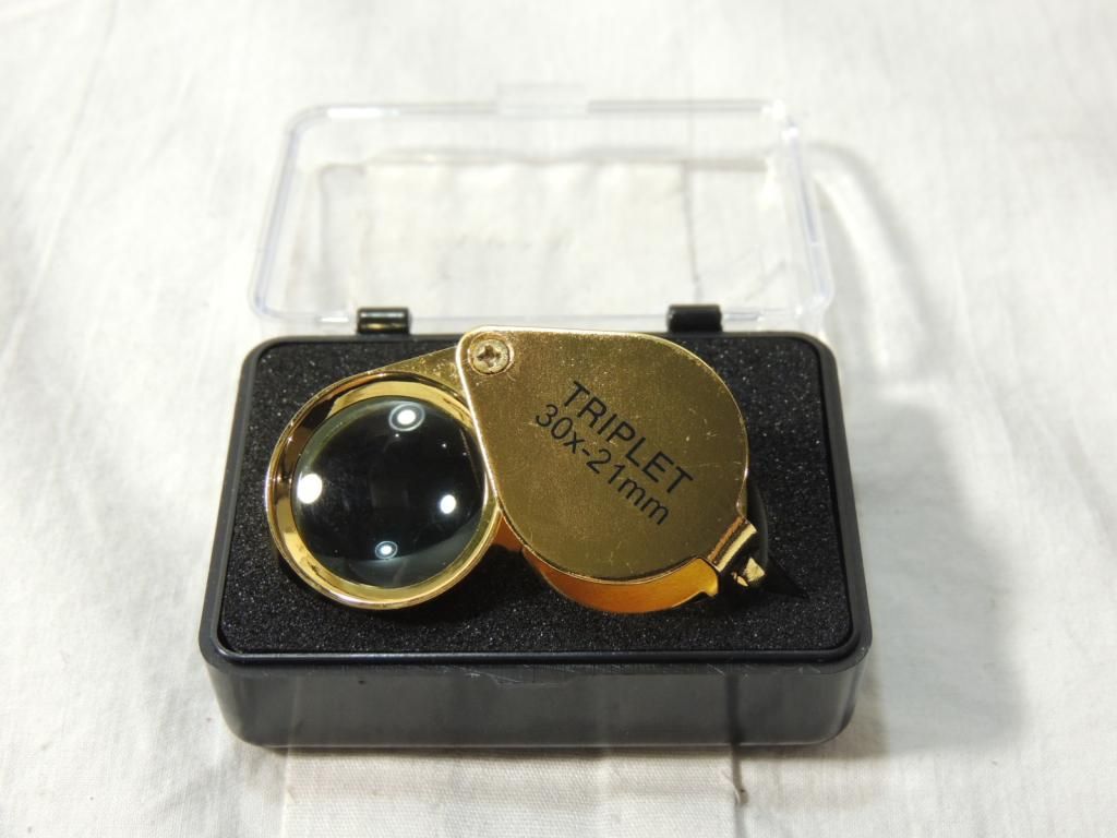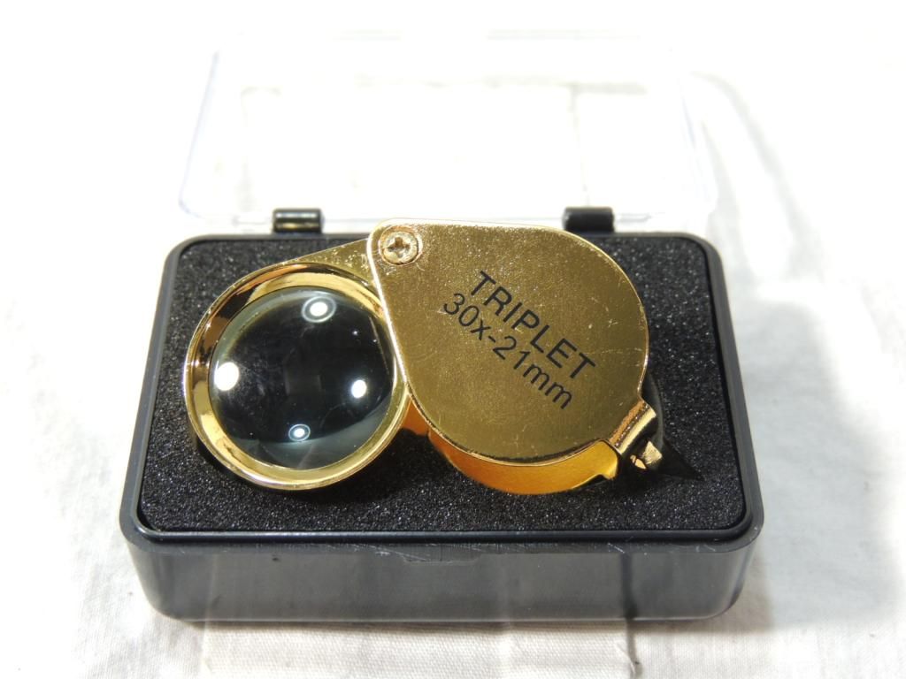 30x 21MM TRIPLET JEWELERS LOUPE WITH CASE. PROTABLE MINI 30X21MM TRIPLET JEWELERY LOUPE FOR JEWELRY TOOL EQUIPMENT. AS SHOWN. SEE PHOTO FOR MORE DETAILS.