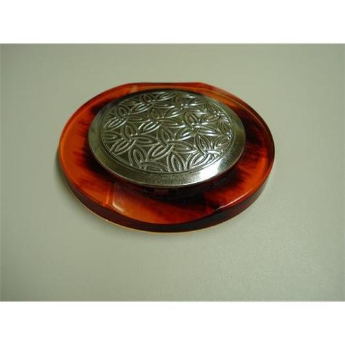 GORGEOUS VINTAGE LADIES COMPACT, MADE FROM WHAT IT SEEMS SILVER TONE METAL AND CARAMEL COLOR BAKELITE, as per images - Signed on the pad*CASABLANCA*, Excellent used condition, the mirror shows spots of age,no chips or cracks, Measuring about 3 1/2" in diam., US Buyer to pay 7.00 for shipping plus insurance.THANKS.