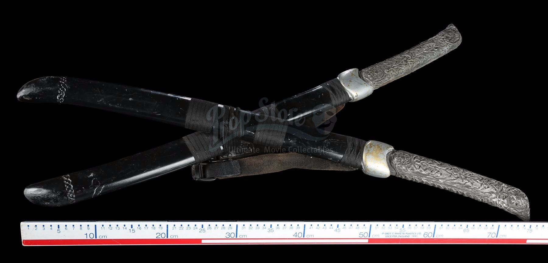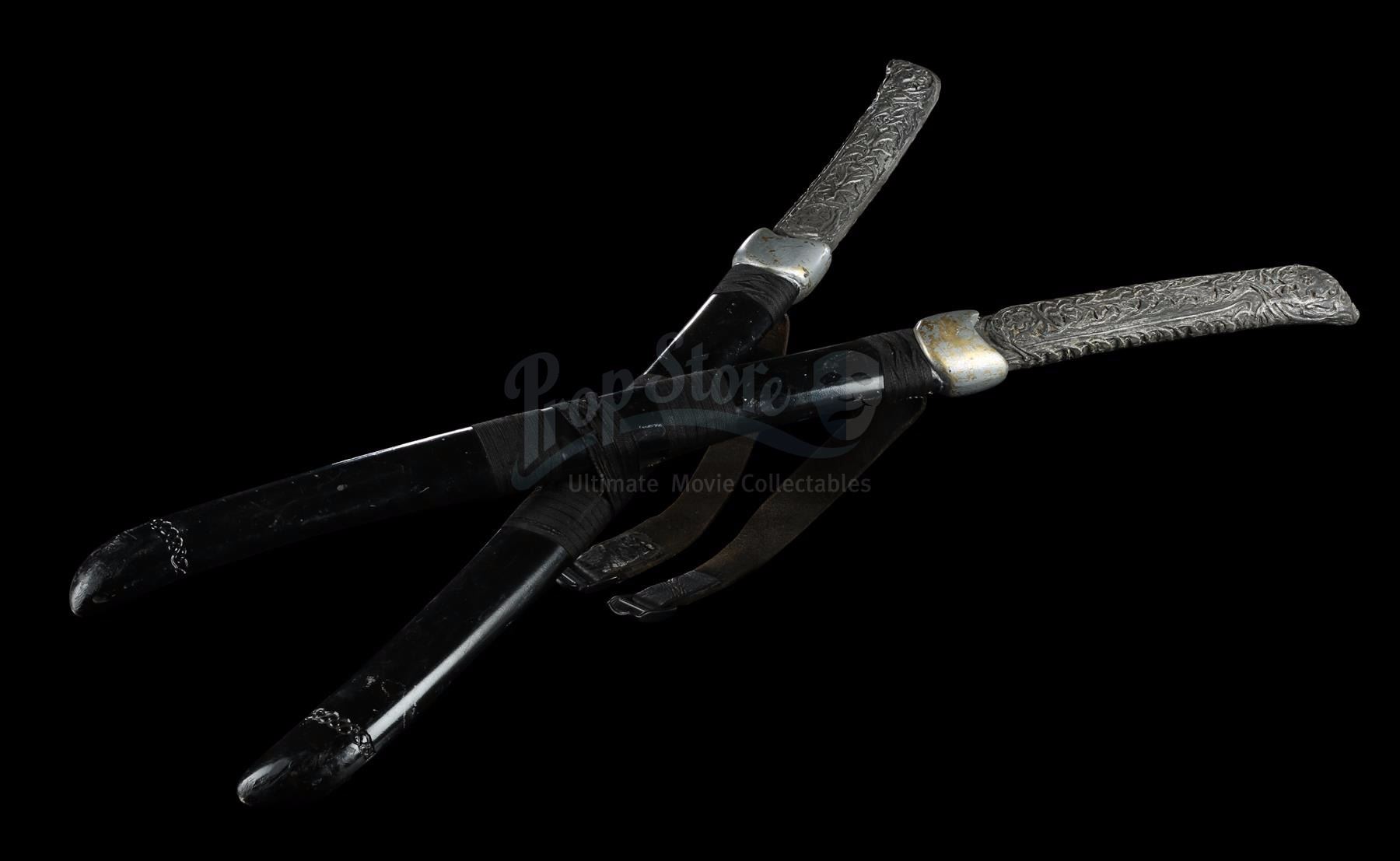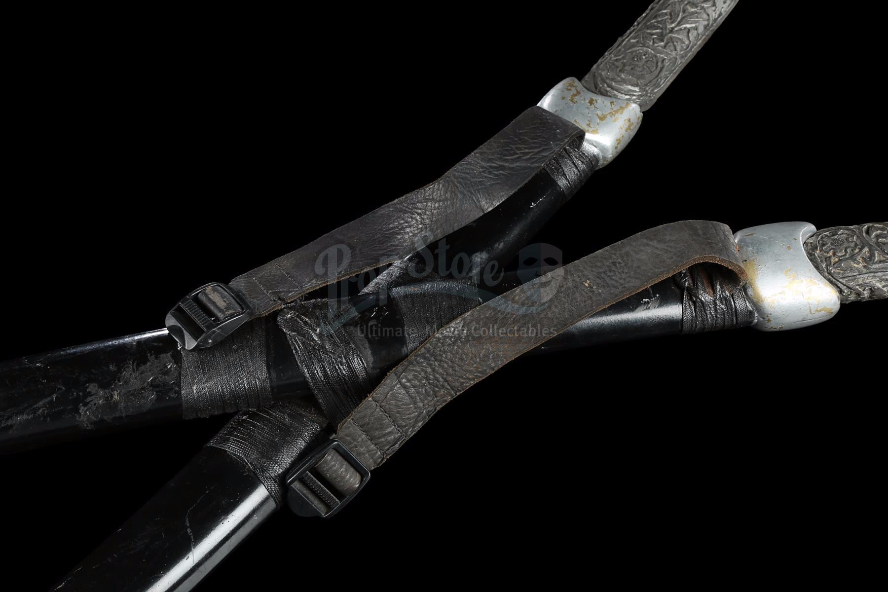 The hard urethane swords have a silver-painted decorative pattern moulded into the body. They rest inside a black fibreglass, twin-crossed scabbard with silver-coloured top; it can be secured to the wearer using flat nylon cord with leather straps and plastic buckles. The swords and scabbard remain in good condition, with wear to the paint and small chips on the scabbard. Accompanied by an official Warner Bros certificate of authenticity. Dimensions: 77 cm x 42cm x 7 cm (30 1/4'' x 16 1/4'' x 2 3/4'')