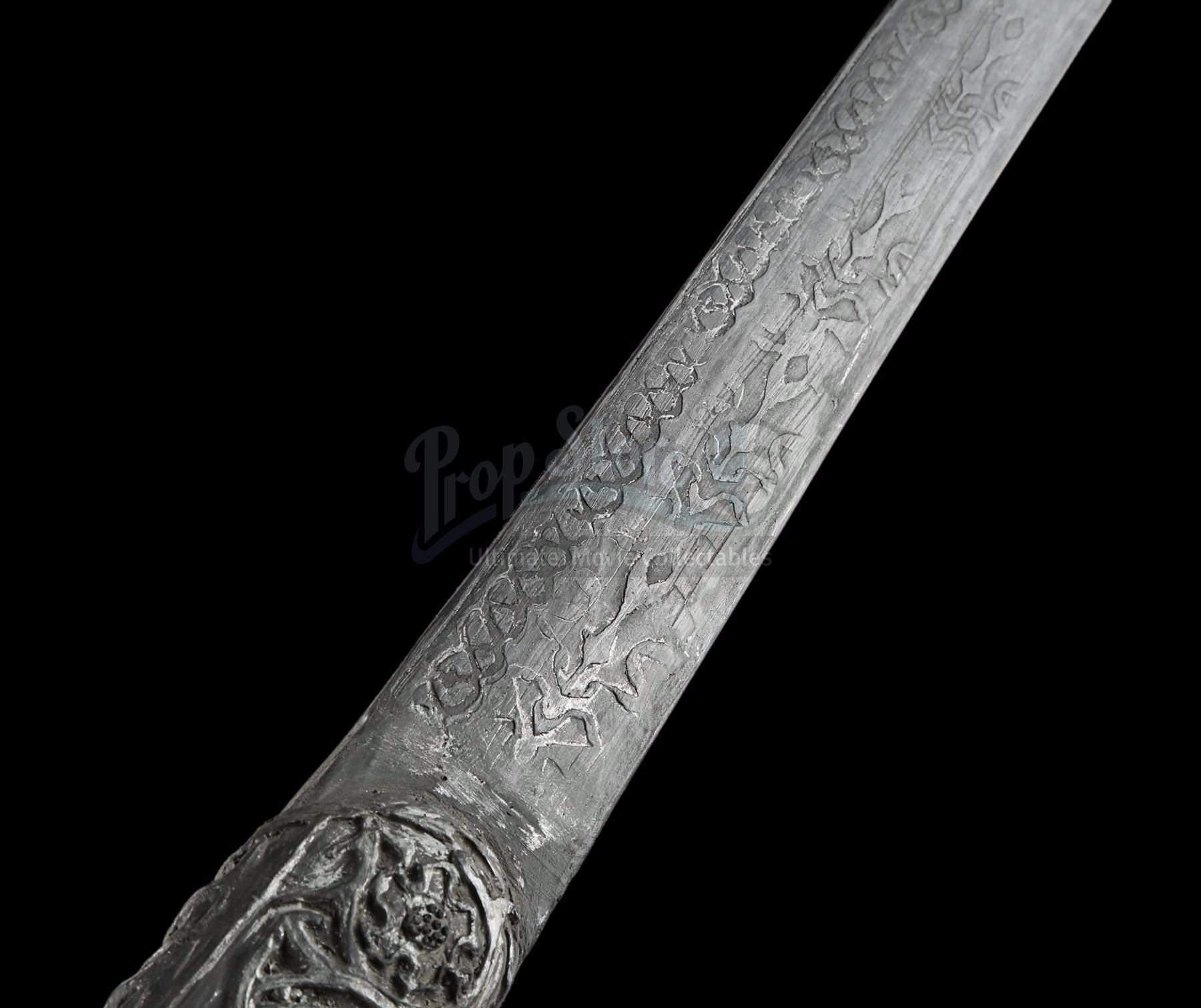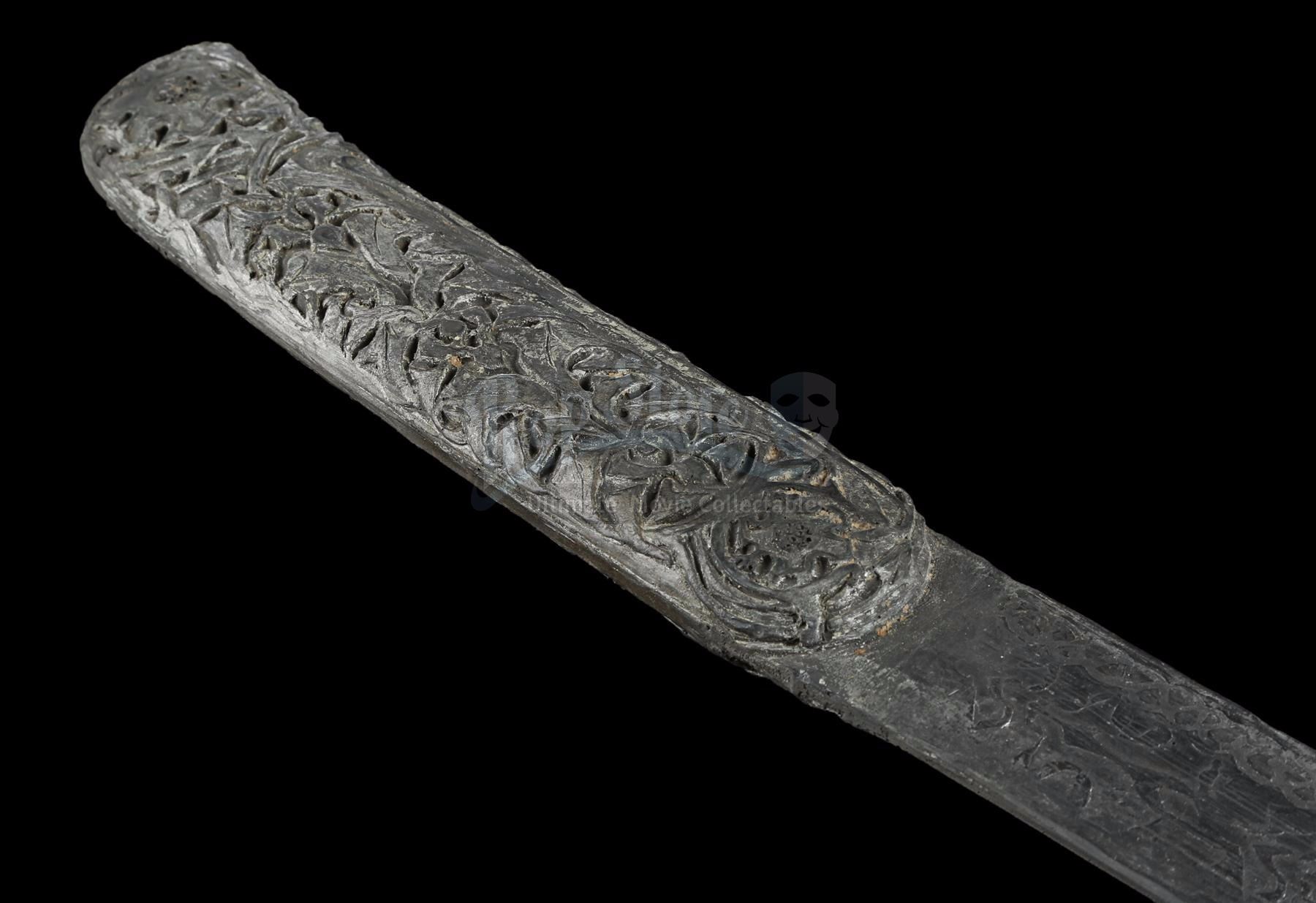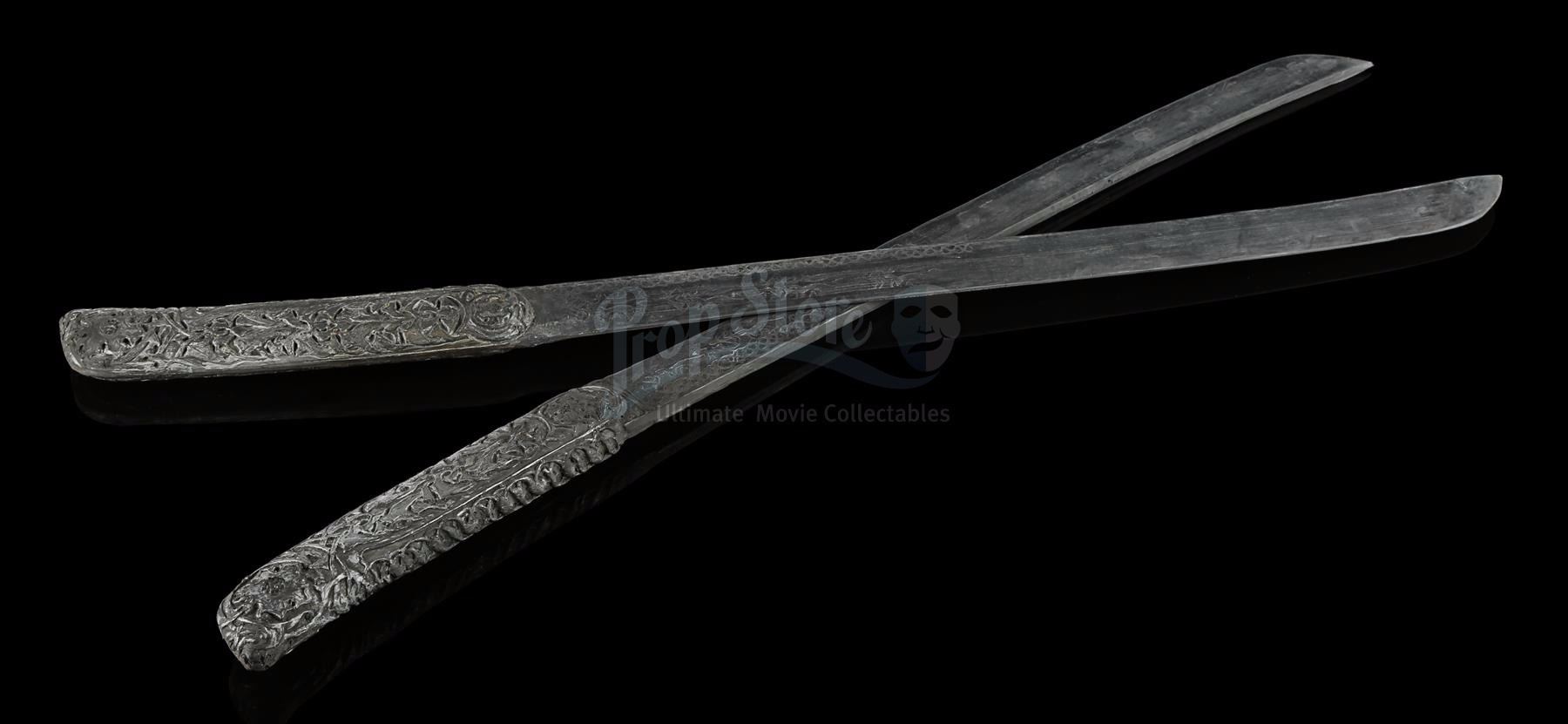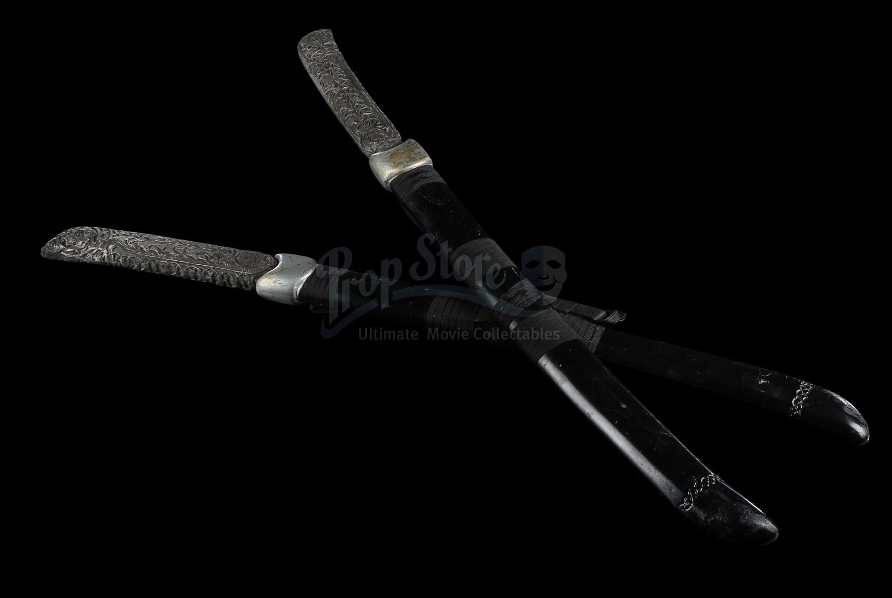 The hard urethane swords have a silver-painted decorative pattern moulded into the body. They rest inside a black fibreglass, twin-crossed scabbard with silver-coloured top; it can be secured to the wearer using flat nylon cord with leather straps and plastic buckles. The swords and scabbard remain in good condition, with wear to the paint and small chips on the scabbard. Accompanied by an official Warner Bros certificate of authenticity. Dimensions: 77 cm x 42cm x 7 cm (30 1/4'' x 16 1/4'' x 2 3/4'')