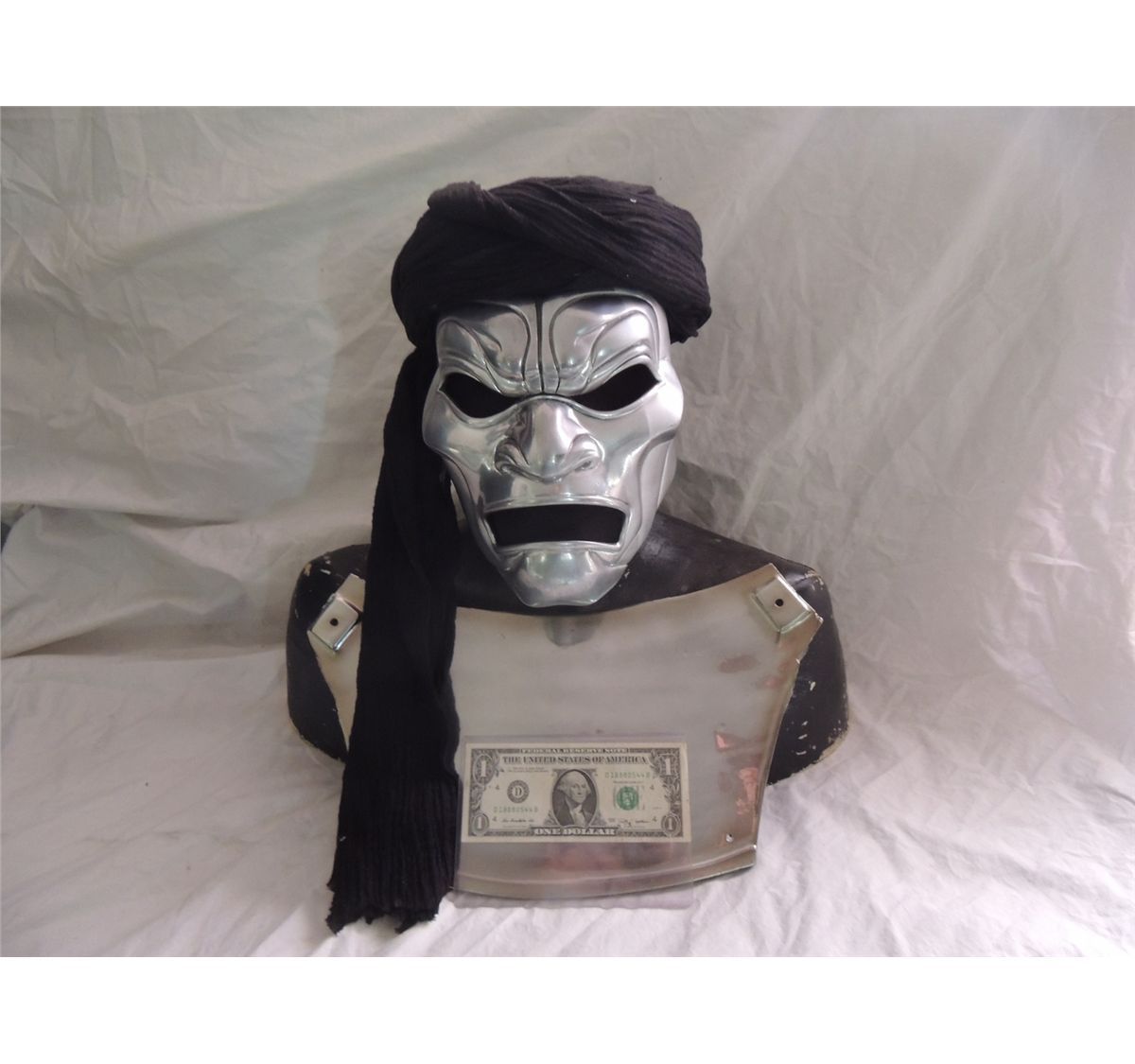 Also included is a "SCREEN USED" turban, but it is unfortunately missing the bottom section that wraps around the chin. There is a piece of duct tape inside marking where the front is. I have not seen the film in a while,but wasn't a turban torn like this on film at some point? Maybe when the mask gets torn off? Could have been lost post production though.