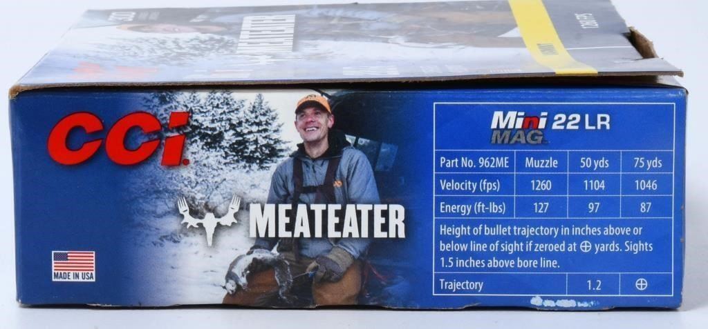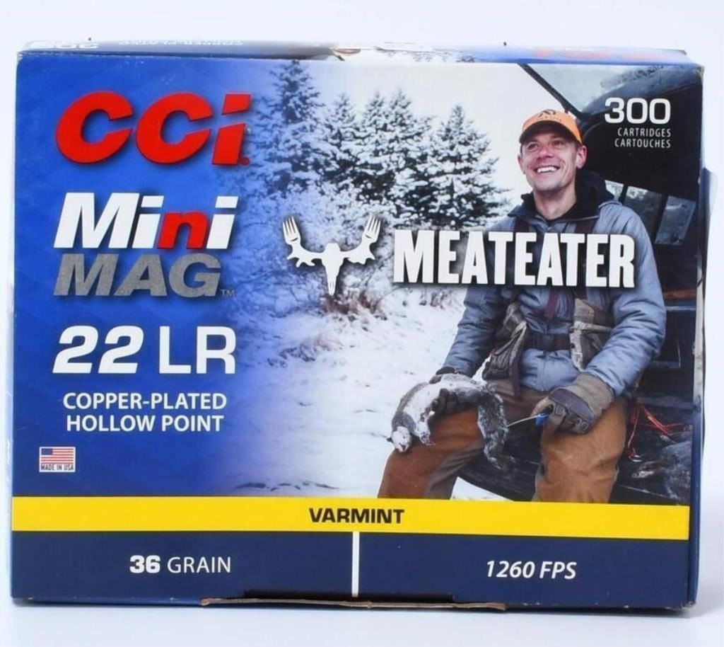 300 Rds CCI Mini-Mag MeatEater Edition .22 LR Ammo 36 Grain Plated Lead Hollow Point CCI MeatEater Special Edition Ammunition features the proven CCI performance and reliability you would expect, along with excited, limited edition packaging. MeatEater?s Steven Rinella relies on high-quality rimfire ammunition to put small game on his plate. CCI partnered with this renowned conservationist, chef, author and hunter on an exclusive line of ammunition, featuring Copper-22, Mini-Mag and Maxi-Mag loads.