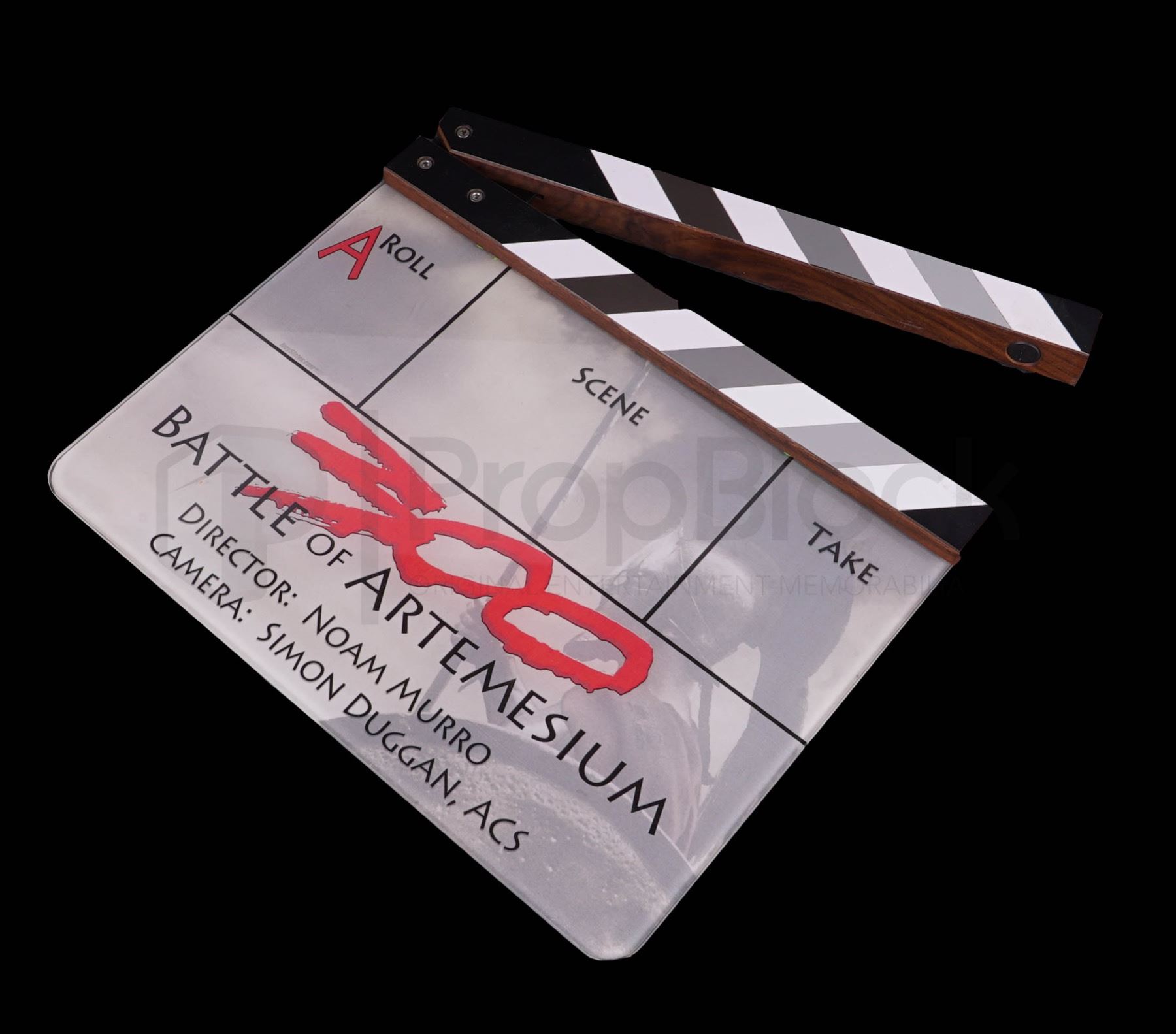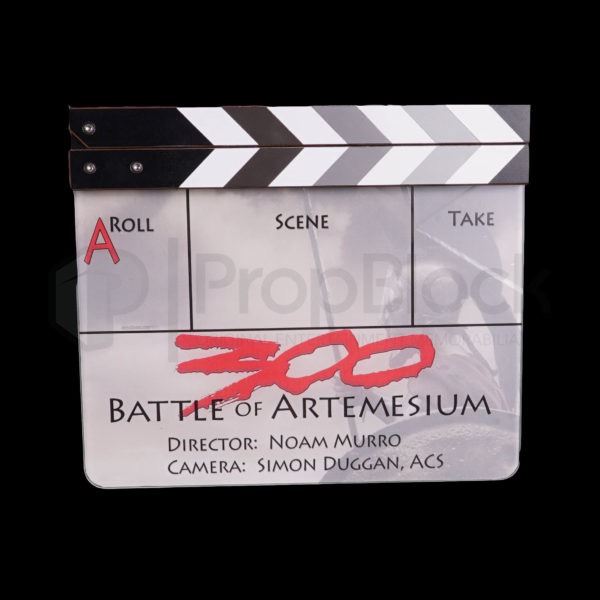 Clapper Board given out to members of the cast and crew after filming of the 300: Rise of an Empire. Greek general Themistokles leads the charge against invading Persian forces led by mortal-turned-god Xerxes and Artemisia, vengeful commander of the Persian navy. Originally titled “300 Battle of Artemisia” this clapper features that title on the front, along with the name of the director and camera operator. This piece features an acrylic board and wooden top with hinge. This item remains in excellent, production made condition.
