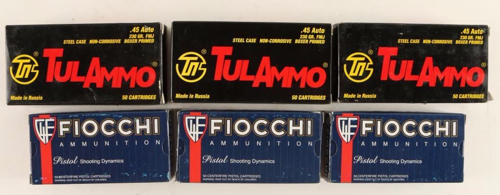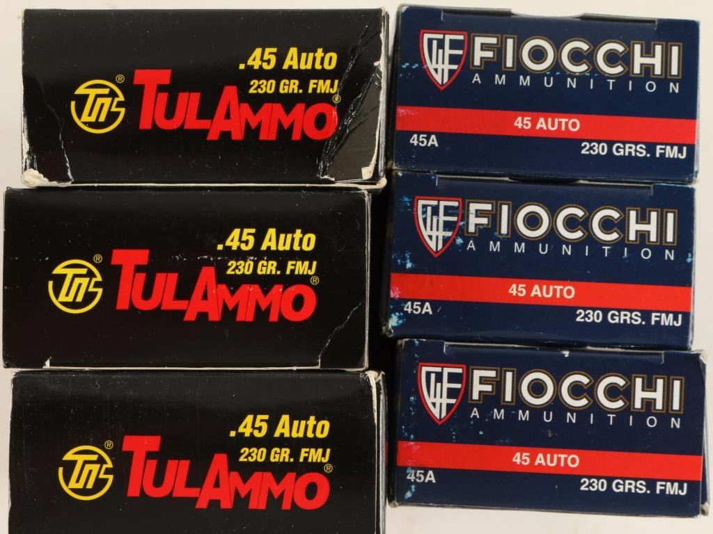 Consisting of three 50 round boxes of Fiocchi 230 grain full metal jacket and three 50 round boxes of Tula steel case 230 grain full metal jacket ammunition.
