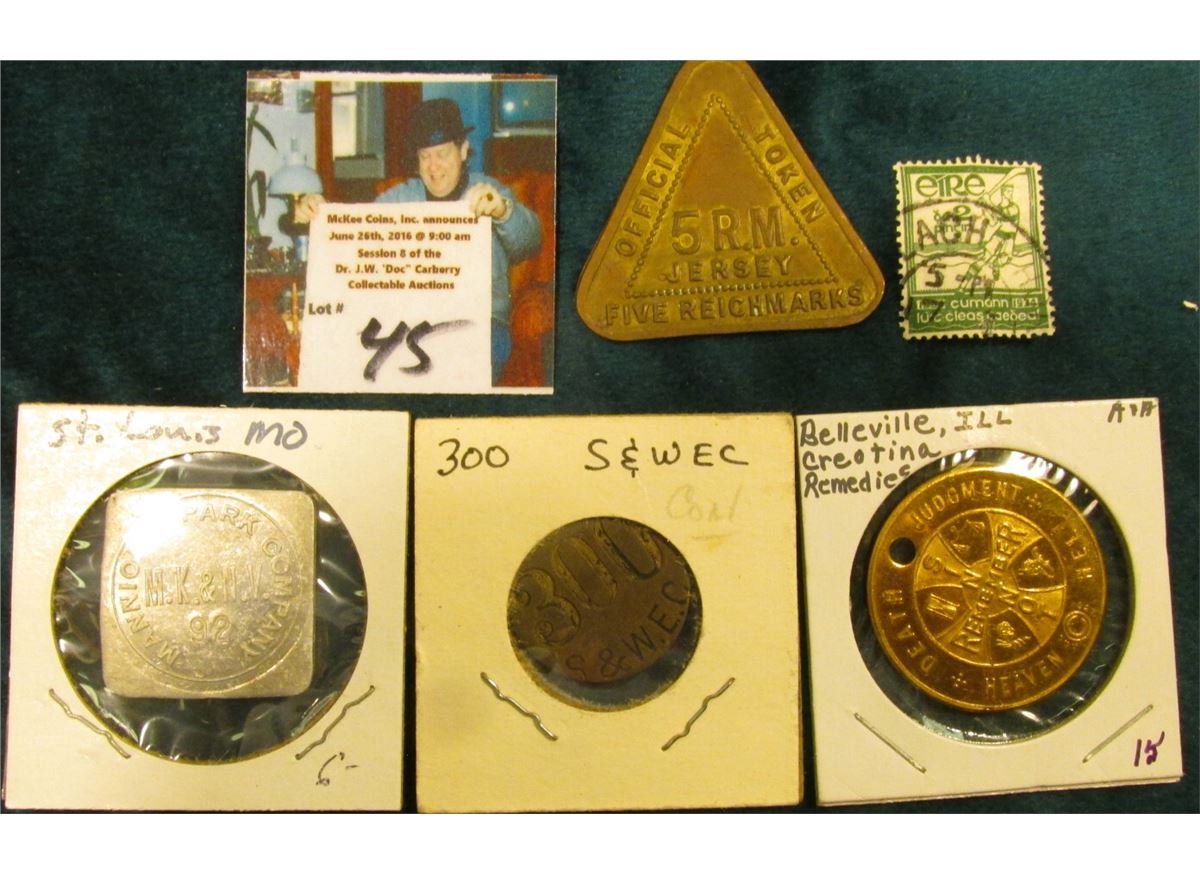 "300/S & W.E.C.", brass uniface token; "Worth More Than Gold/So Are/Creotina/Money Back Guarantee/Remedies/Belleville, Ill., rev. "Death Judgement/Heaven Hell/Remember/Sin not", Brass medal, holed, 31mm, BU; "Mannions Park Company/M.K. & N.V./98", "Good For/5c/In Merchandise", al., sq.; cancelled Ireland Postage Stamp; & Germany "Official Token 5 R.M./Jersey/Five Reichmark", triangular token.