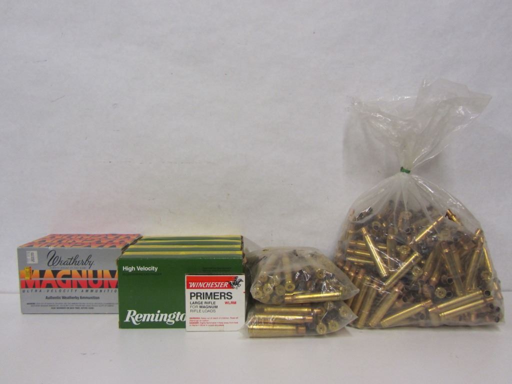 300 WEATHERBY MAG 4 BOXES OF REMINGTON AMMO, 3 BOXES OF WEATHERBY AMMO (2 PART BOXES), 1 PACK LARGE MAGNUM RIFLE PRIMERS, PLUS 3 BAGS UNPRIMED BRASS