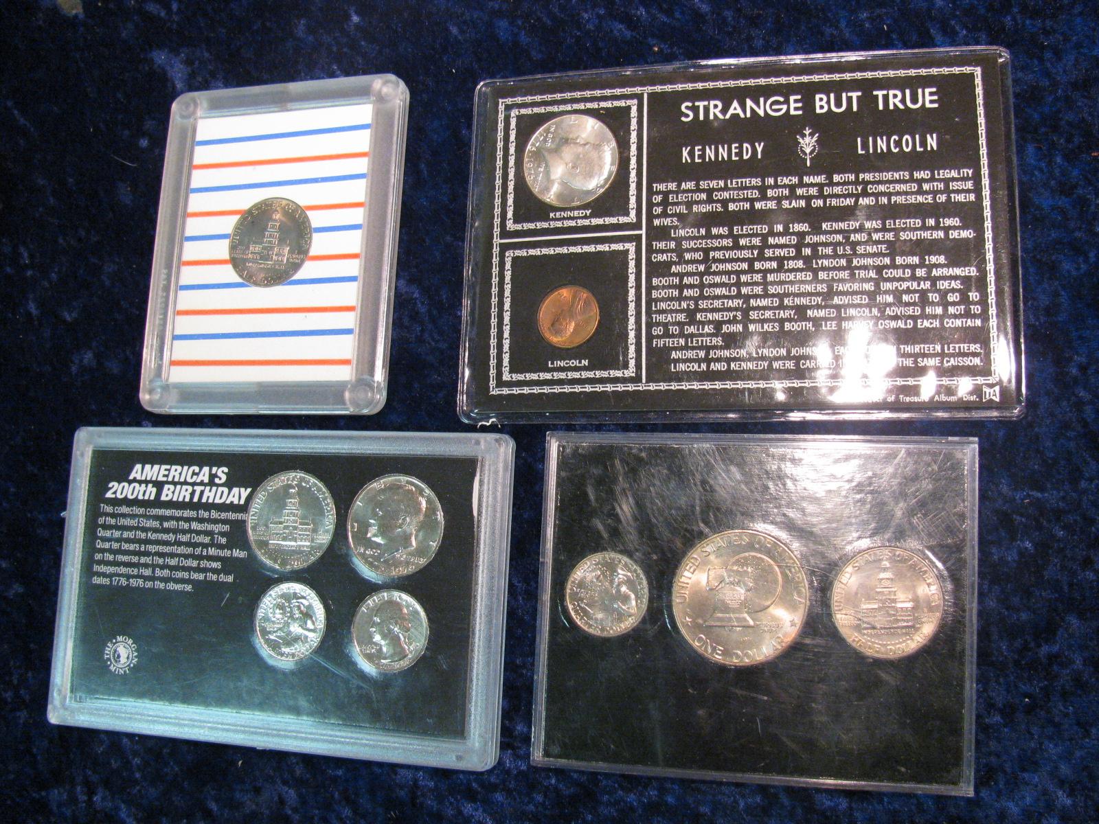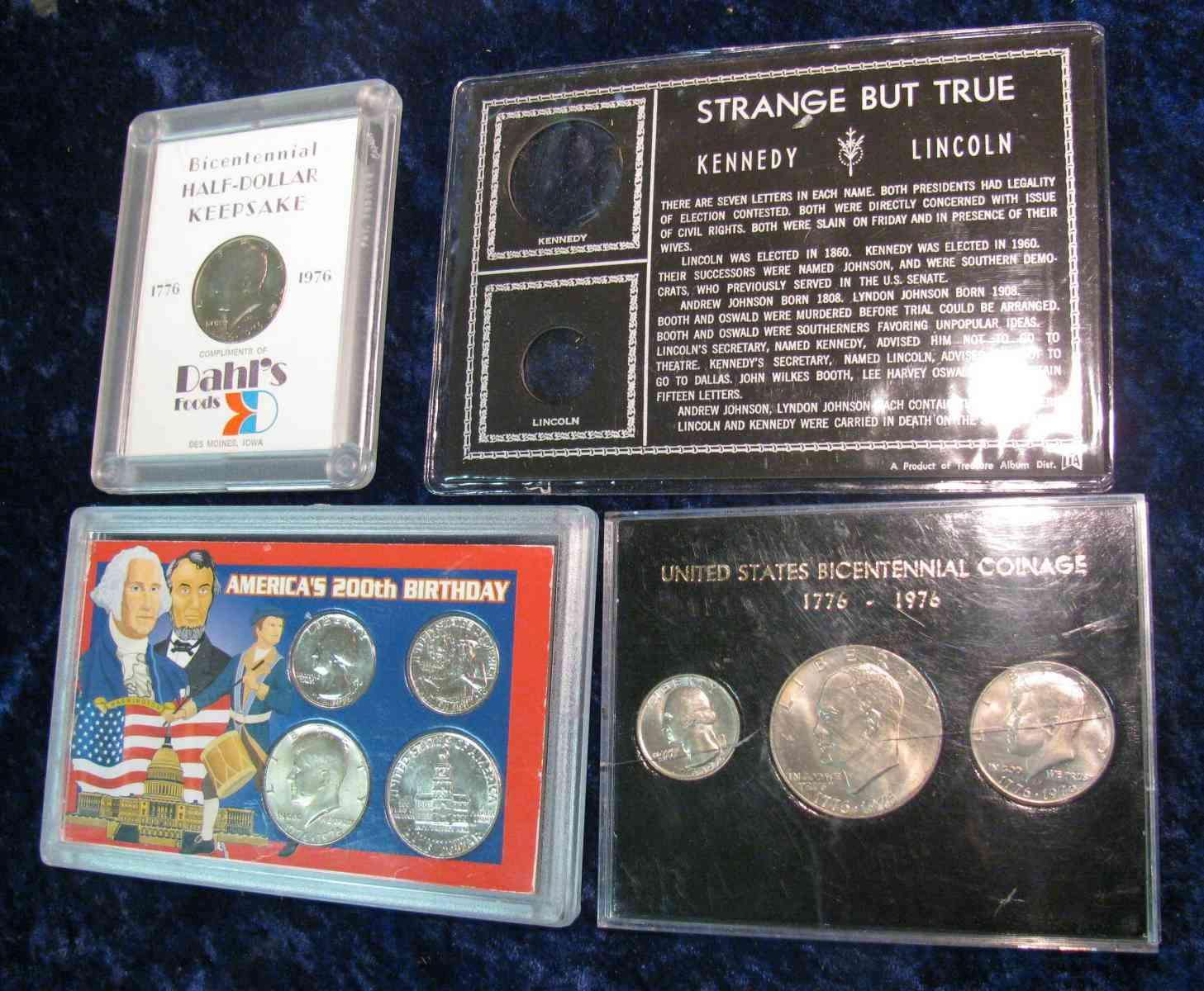 301. Strange But True Kennedy Set with coins; Dahl’s 1976D Bicentennial Half-Dollar Keepsake in Case; America's 200th Birthday 4-Piece Coin Set; & Three Piece Bicentennial Quarter to Dollar Set.