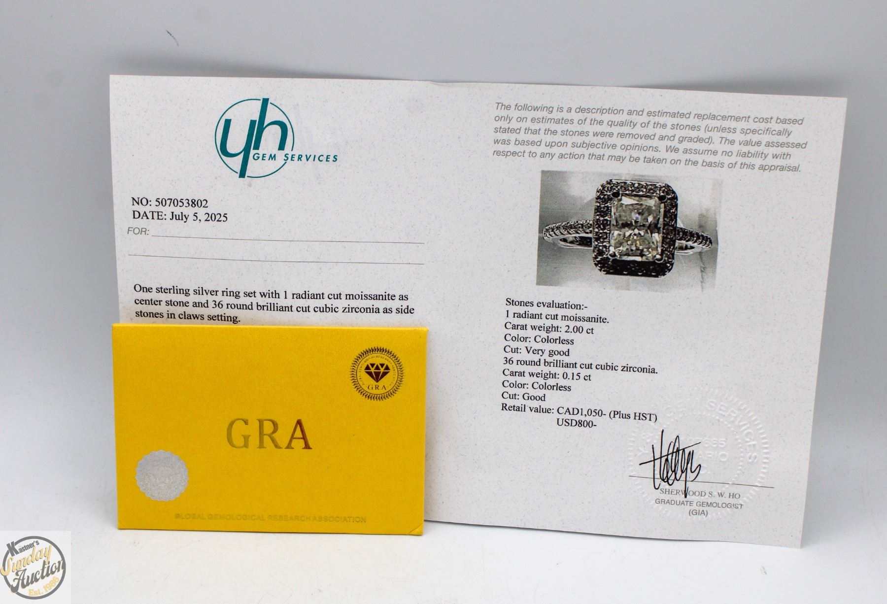 MOISSANITE STONE VVS D COLOR WITH 36 ROUND BRILLIANT CUT CUBIC ZIRCONIA SET IN RECTANGULAR HALO WITH SOME ON SET IN SHANKS SET IN 925 SILVER RING SIZE 7 RETAIL VALUE $1,050.00 **ALL ITEMS MUST BE REMOVED BY 5PM SATURDAY, AUGUST 16TH 2025. ALL REMAINING ITEMS WILL BE SUBJECT TO A $6.00 PER DAY STORAGE CHARGE. ANY ITEMS REMAINING AFTER MONDAY, SEPTEMBER 1ST 2025 WILL BE CONSIDERED FORFEITED. NO REFUNDS WILL BE ISSUED FOR FORFEITED ITEMS. TO SCHEDULE A PICK UP APPOINTMENT CLICK HERE