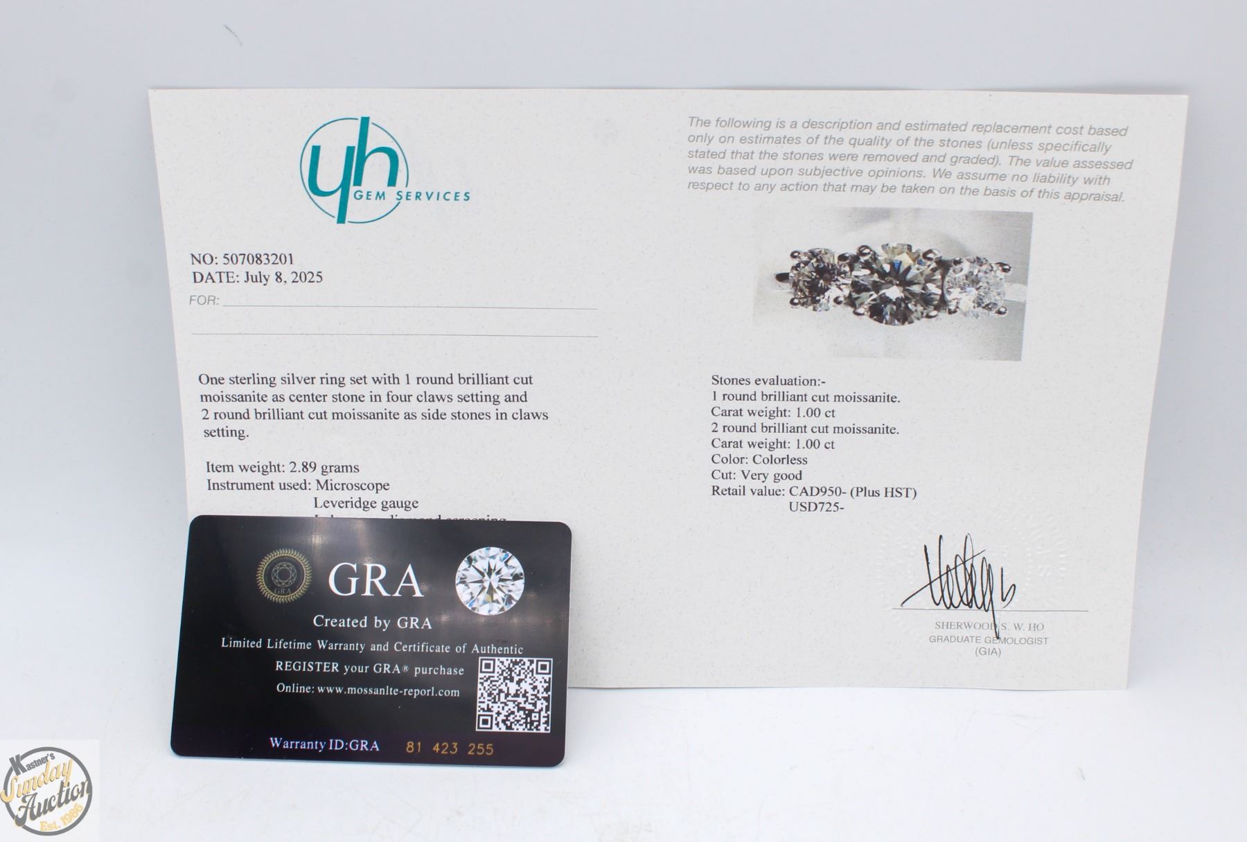 BRILLIANT CUT MOISSANITE STONES VVS D COLOR SET WITH 1.00 CT MOISSANITE SET IN CENTER WITH 0.50 CT SET ON EITHER SIDE SET IN 925 SILVER RING SIZE 8 RETAIL VALUE $950.00 **ALL ITEMS MUST BE REMOVED BY 5PM SATURDAY, SEPTEMBER 6TH 2025. ALL REMAINING ITEMS WILL BE SUBJECT TO A $6.00 PER DAY STORAGE CHARGE. ANY ITEMS REMAINING AFTER MONDAY, SEPTEMBER 22ND 2025 WILL BE CONSIDERED FORFEITED. NO REFUNDS WILL BE ISSUED FOR FORFEITED ITEMS. TO SCHEDULE A PICK UP APPOINTMENT CLICK HERE