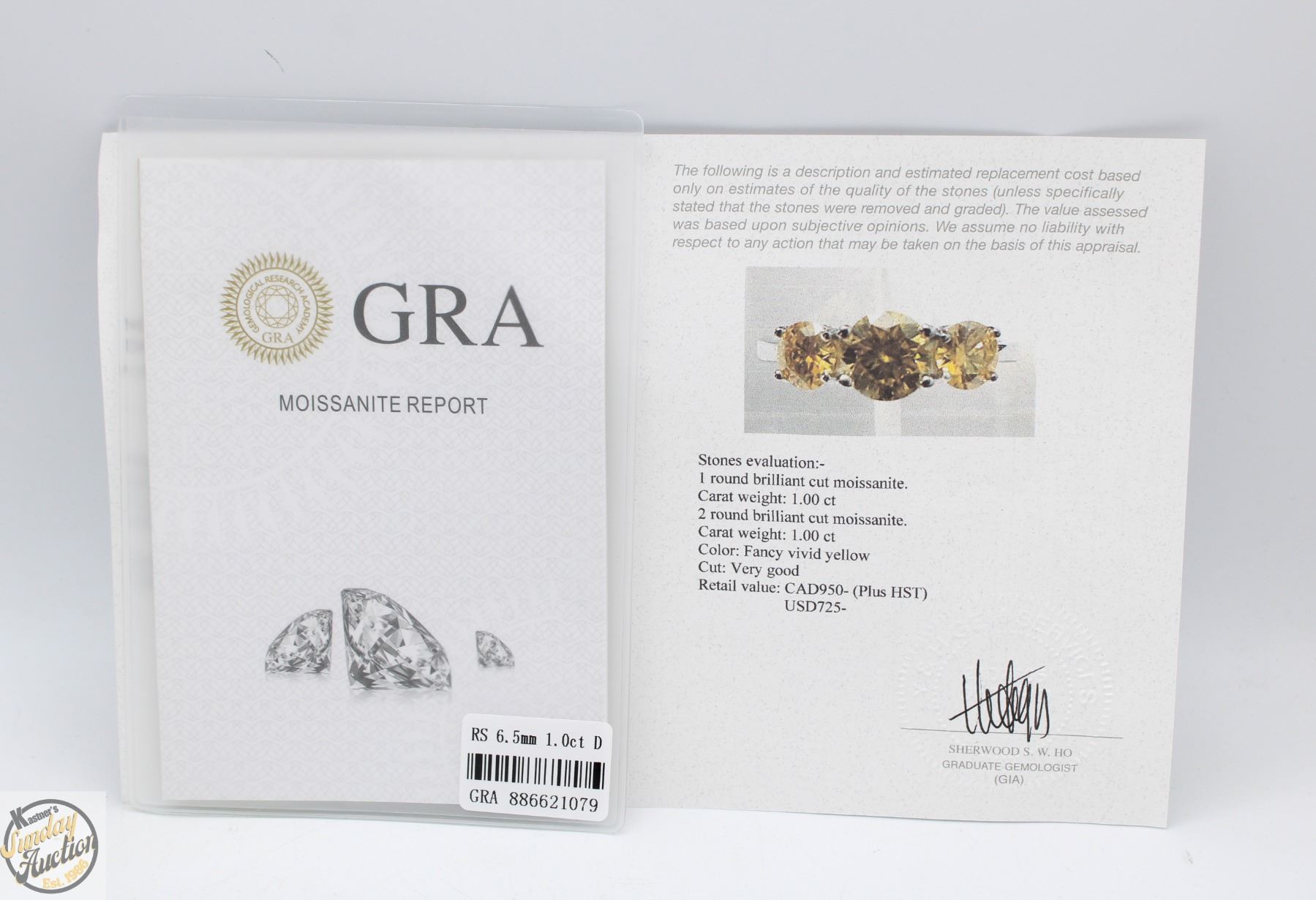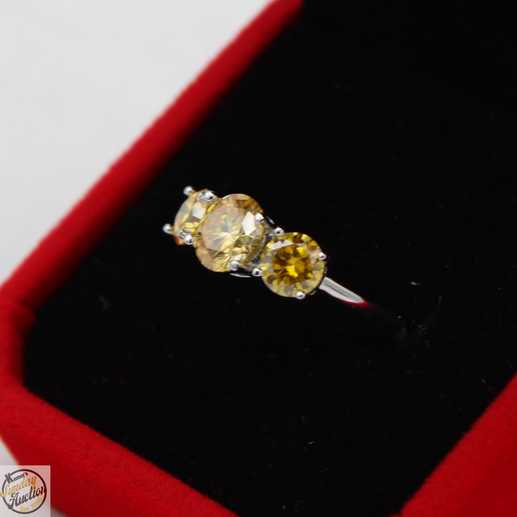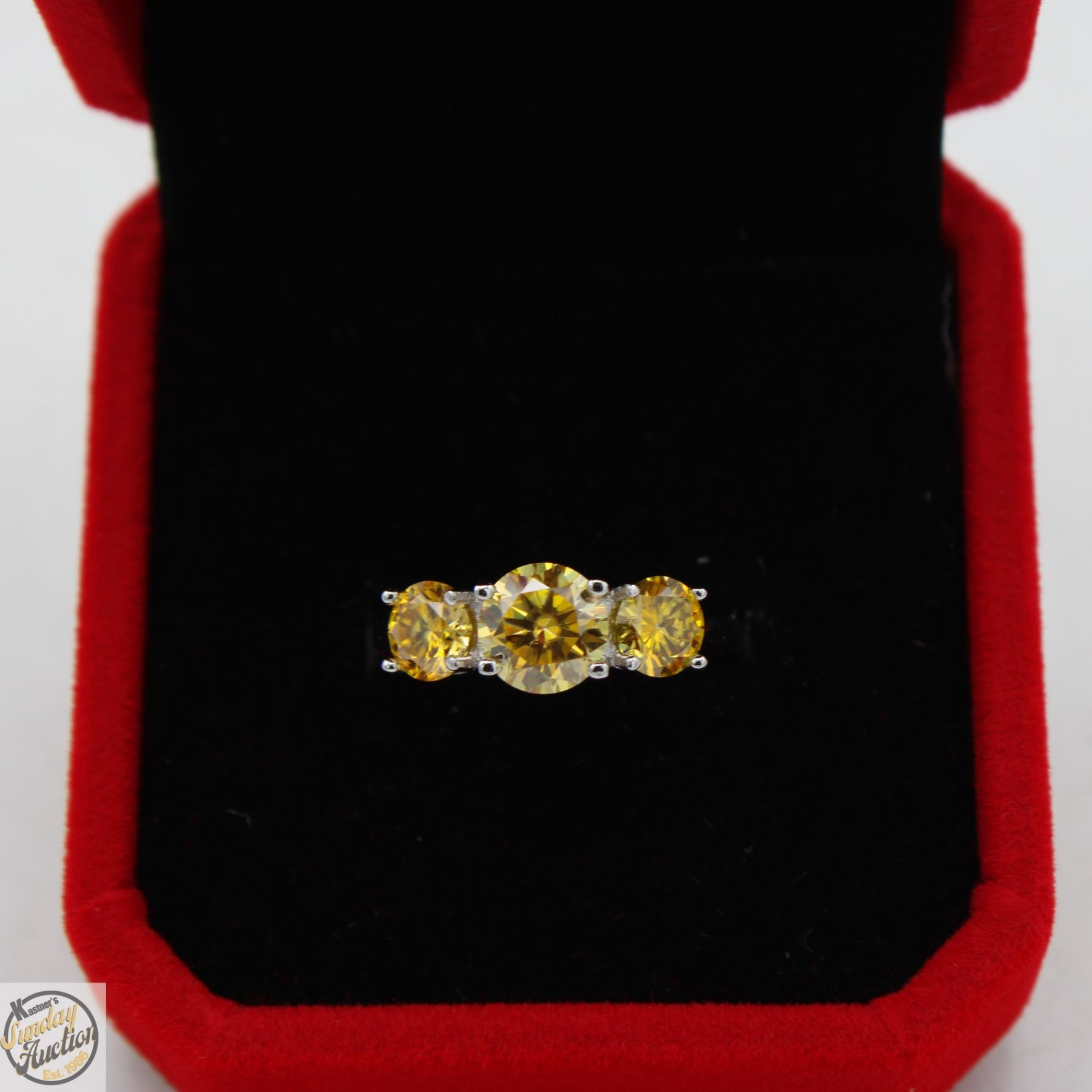 BRILLIANT CUT MOISSANITE STONES VVS YELLOW COLOR SET WITH 1.00 CT MOISSANITE SET IN CENTER WITH 0.50 CT SET ON EITHER SIDE SET IN 925 SILVER RING SIZE 6 RETAIL VALUE $950.00 **ALL ITEMS MUST BE REMOVED BY 5PM SATURDAY, AUGUST 23RD 2025. ALL REMAINING ITEMS WILL BE SUBJECT TO A $6.00 PER DAY STORAGE CHARGE. ANY ITEMS REMAINING AFTER MONDAY, SEPTEMBER 8TH 2025 WILL BE CONSIDERED FORFEITED. NO REFUNDS WILL BE ISSUED FOR FORFEITED ITEMS. TO SCHEDULE A PICK UP APPOINTMENT CLICK HERE