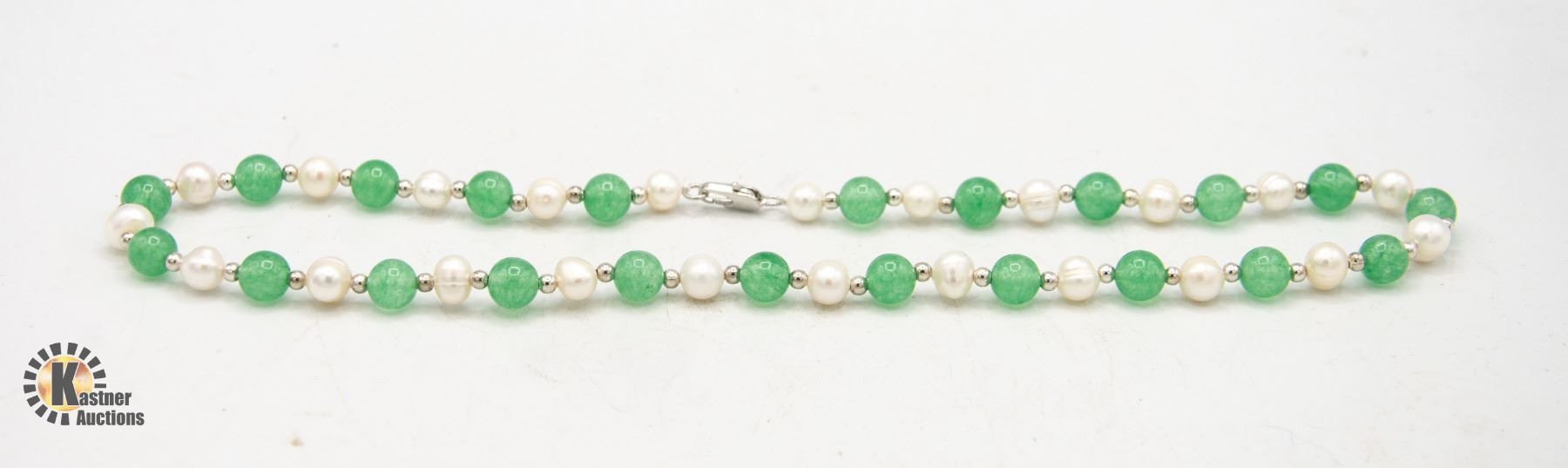 #302-NATURAL FRESH WATER PEARL ,GREEN JADE NECKLAC