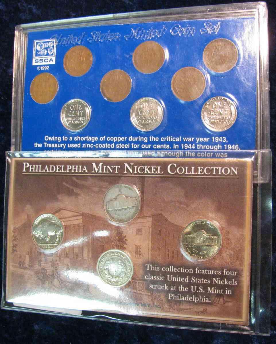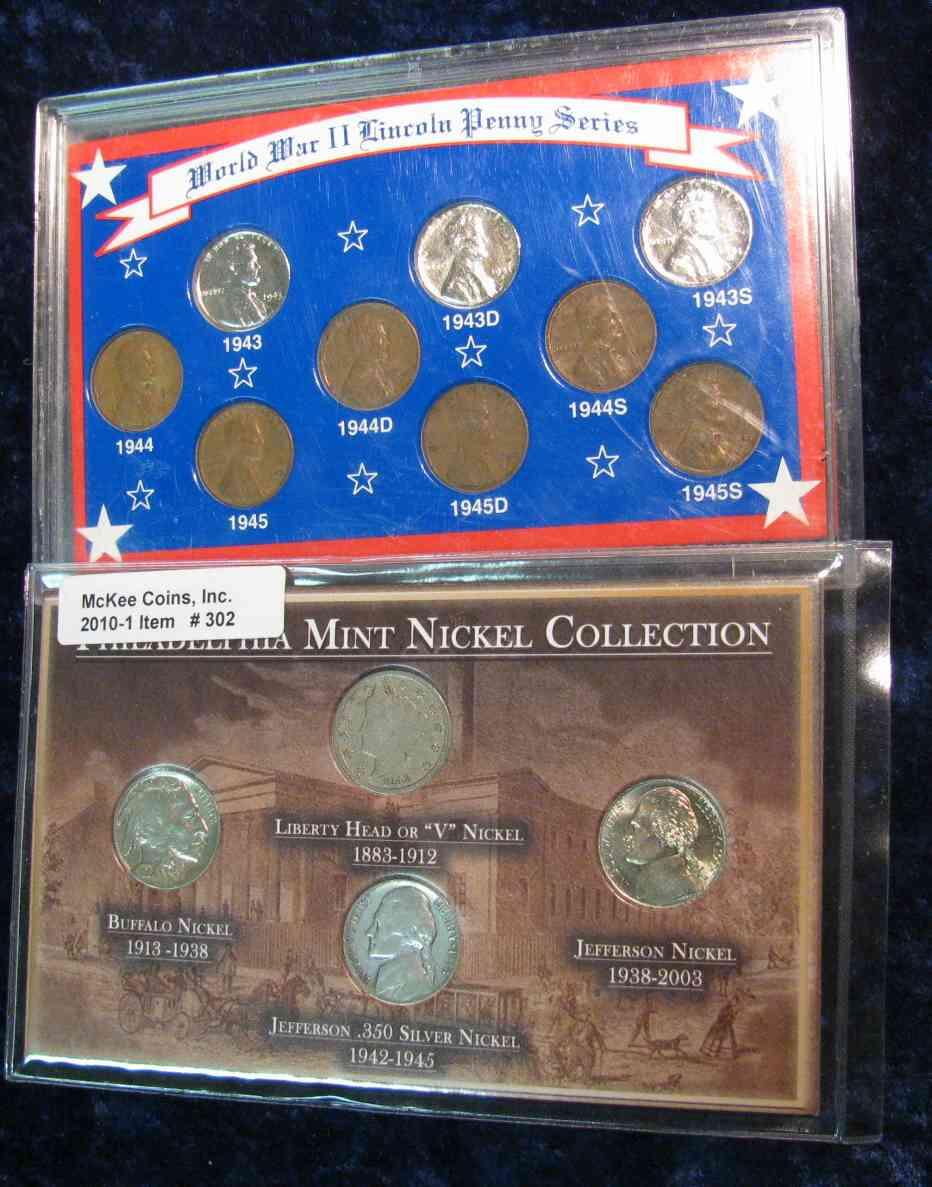 302. World War II Lincoln Penny Series Set in case. Includes Steel Cents & Shell case cents; & 4 pcs. Philadelphia Mint Nickel Collection (includes Buffalo, Liberty, & two types of Jefferson Nickels.