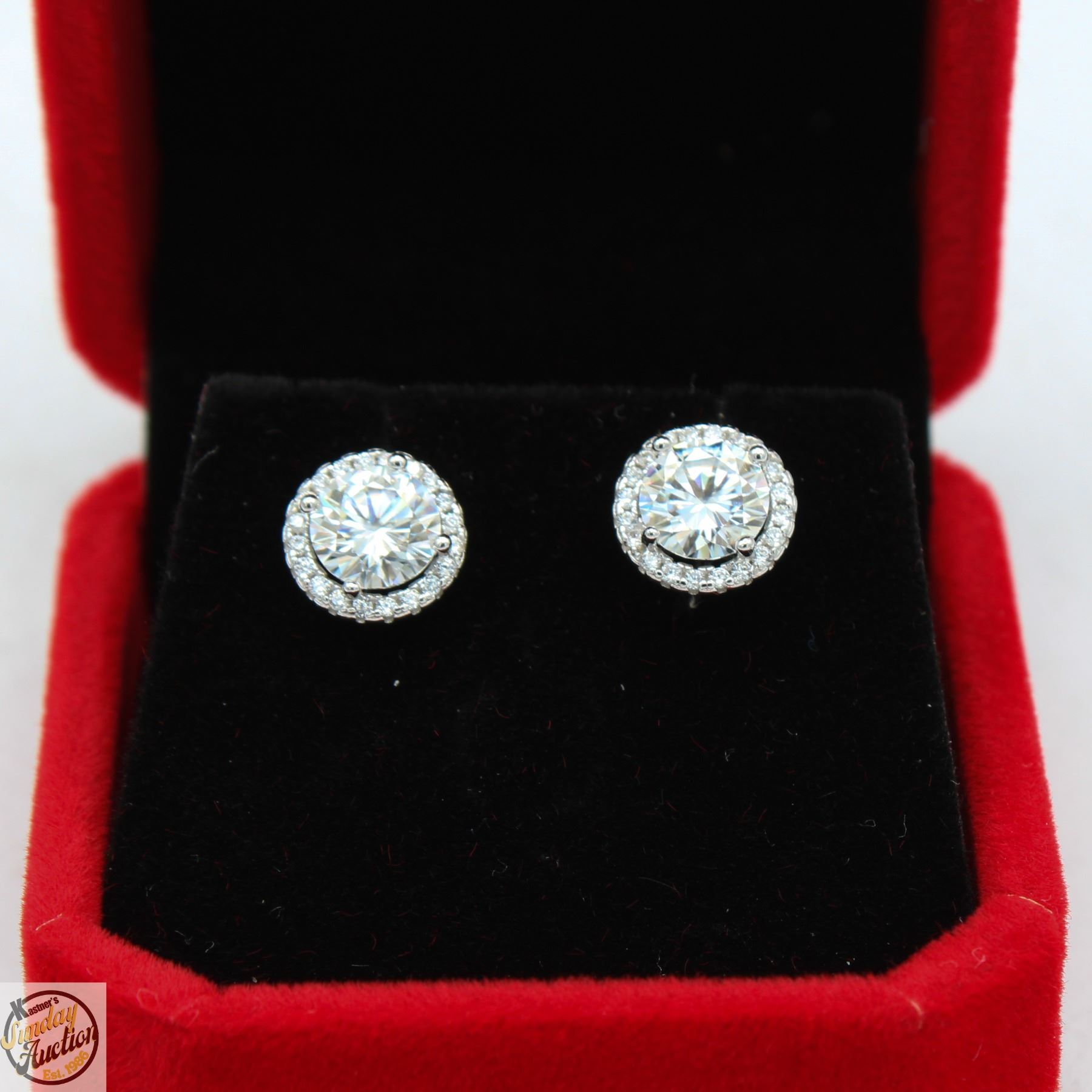 CUT MOISSANITE STONES VVS BLUISH GREY COLOR WITH 40 ROUND BRILLIANT CUT CUBIC ZIRCONIA SET IN ROUND HALOS SET IN 925 SILVER EARRINGS RETAIL VALUE $925.00 **ALL ITEMS MUST BE REMOVED BY 5PM SATURDAY, AUGUST 16TH 2025. ALL REMAINING ITEMS WILL BE SUBJECT TO A $6.00 PER DAY STORAGE CHARGE. ANY ITEMS REMAINING AFTER MONDAY, SEPTEMBER 1ST 2025 WILL BE CONSIDERED FORFEITED. NO REFUNDS WILL BE ISSUED FOR FORFEITED ITEMS. TO SCHEDULE A PICK UP APPOINTMENT CLICK HERE