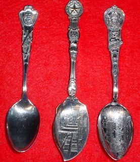 3030 - Three spoons: (a) Sterling 925 spoon with six-gun motif: TEXAS CENTRAL RAILWAY, in operation from 1879. Presentation/engraved “A.Higgins”. (b) Silver plated TEXAS CENTENNIAL commemorative spoon with date of Battle of San Jacinto, April 21,1836, which assmotif: TEXAS CENTRAL RAILWAY, in operation from 1879. Presentation/engraved “A.Higgins”. (b) Silver plated TEXAS CENTENNIAL commemorative spoon with date of Battle of San Jacinto, April 21,1836, which assured Texas Independence from