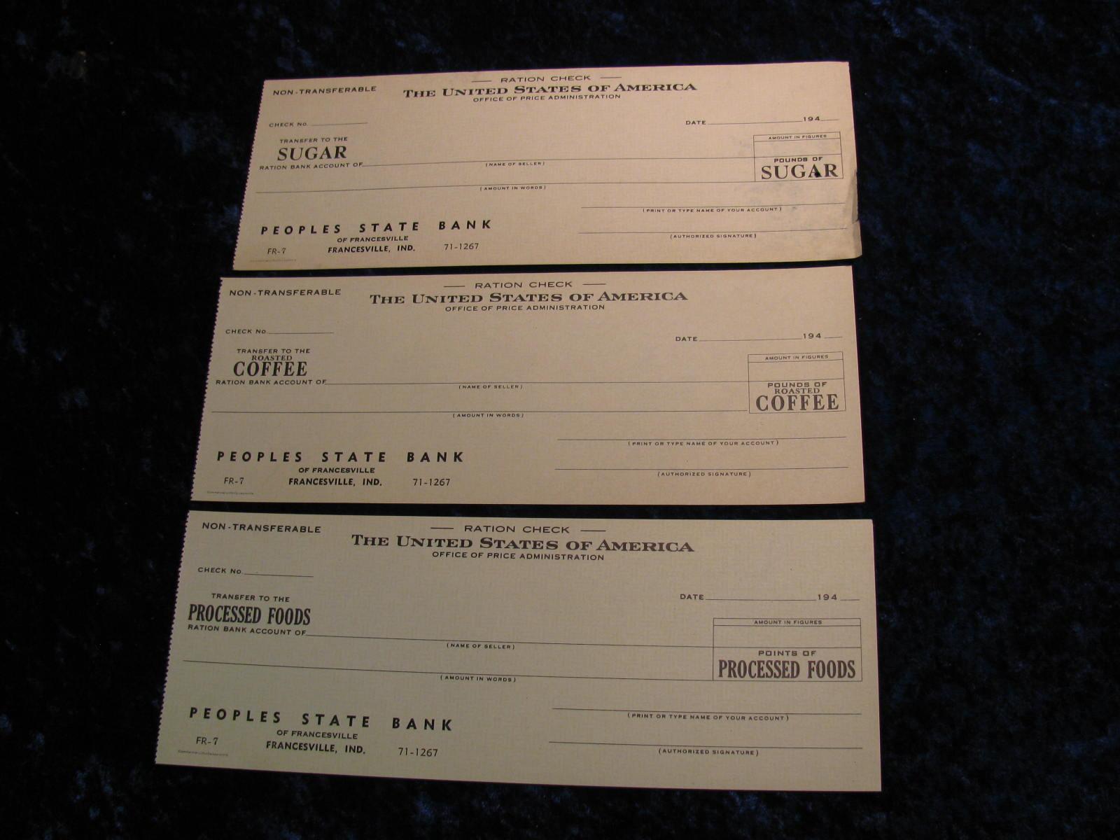 3051. (3) 1940's Ration Checks, Sugar, Coffee, Processed Foods.