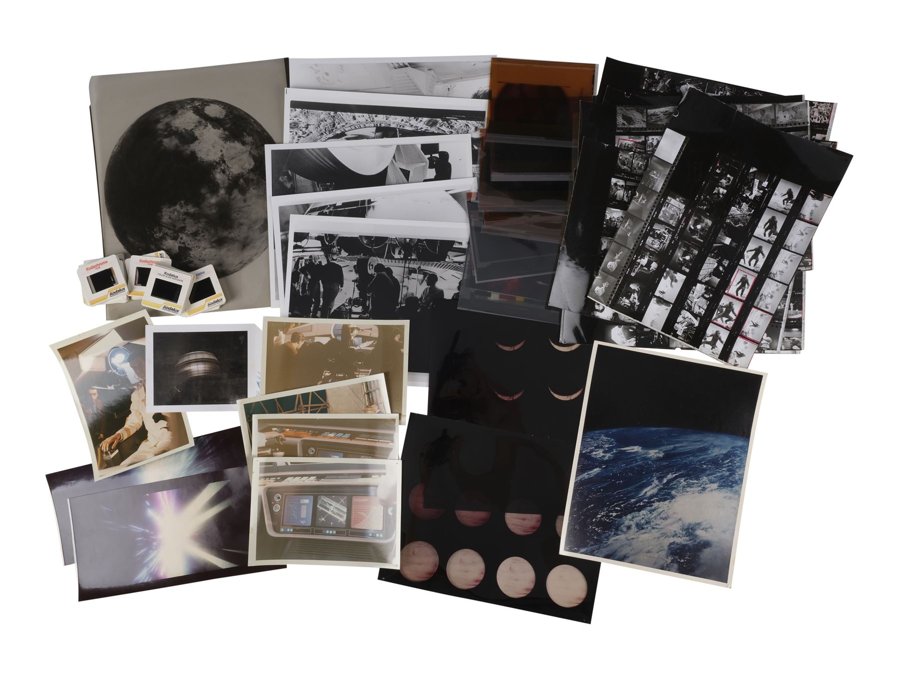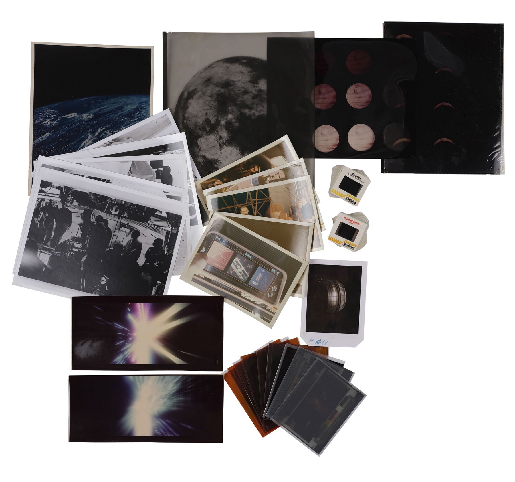 This lot from the collection of Trumbull consists of 11 black-and-white contact sheets taken by the production photographer featuring never-before-seen content from the production, with each sheet hand-annotated in red ink and graphite; 14 additional color- and black-and-white-printed photographs; two black transparencies of the moon and one of test planets; nine negatives with a card marked "Transparency of Stargate Corridor Sequence -'2001'-" in an envelope marked "'2001' 4x5 internegatives for D.T's Pictorial biography" and "270-13"; and a set of 41 35mm Kodalux slides with two blank negatives strips in a Kodalux box marked "2001 8x10's." This lot exhibits discoloration and bends to the photos. Dimensions: (largest) 10" x 12" (25.5 cm x 30.5 cm)Visual effects pioneer Douglas Trumbull was born in Los Angeles in 1942. After abandoning architecture for technical drawing and cartooning, his talent for photorealism soon earned him work at Graphic Films, an esteemed Hollywood studio for which he designed groundbreaking cosmic effects for the 1964 New York World's Fair. After seeing Trumbull's work, director Stanley Kubrick hired him to create animations and VFX shots - including the iconic Star Gate sequence - for what would become his seminal masterpiece 2001: A Space Odyssey. From that film's success, Trumbull became one of the industry's most trusted photographic effects experts, designing and producing legendary screen moments in such sci-fi landmarks as Close Encounters of the Third Kind, Star Trek: The Motion Picture, and Blade Runner, all three of which earned him Academy Award& reg; nominations. In addition to directing the cult classics Silent Running and Brainstorm, Trumbull later received a Scientific and Engineering Award for his high-speed photography process Showscan in 1993, one of two specialty awards given to him by the Academy of Motion Picture Arts and Sciences before his death in 2022. 60 years since he first made his mark on global cinema, Propstore today celebrates Douglas Trumbull by presenting a selection of rare memorabilia from his personal collection to the public.
