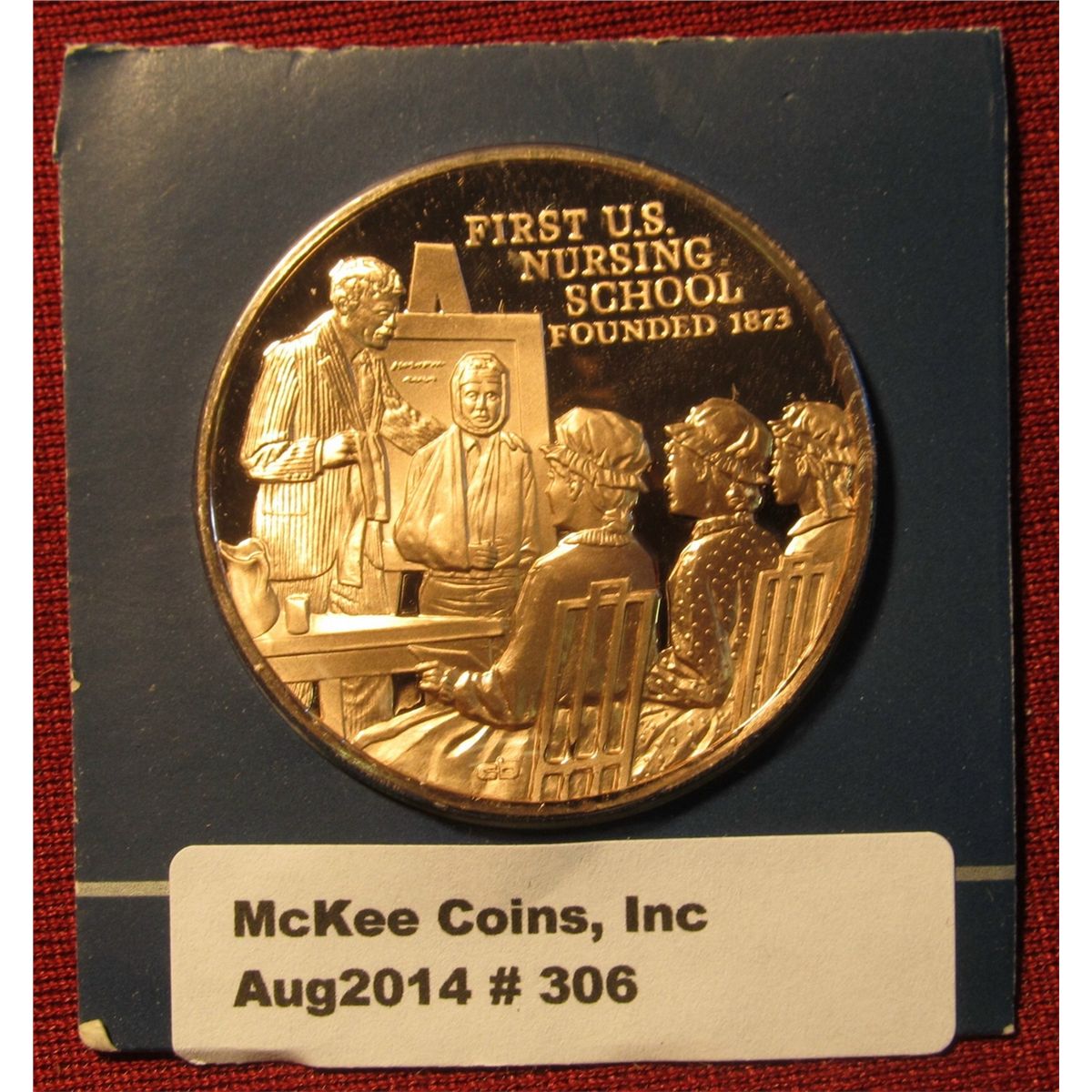 306. "First U.S. Nursing School Founded 1873" Proof Bronze Medal. 1 1/2" diameter. In original holder as issued by the Franklin Mint.