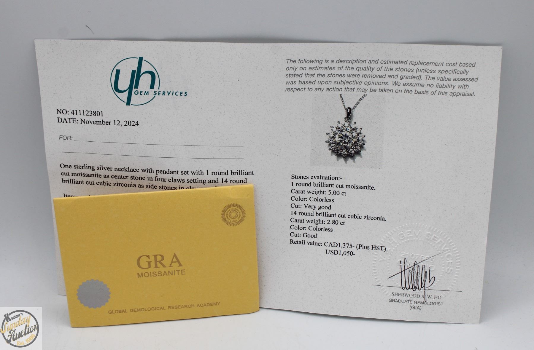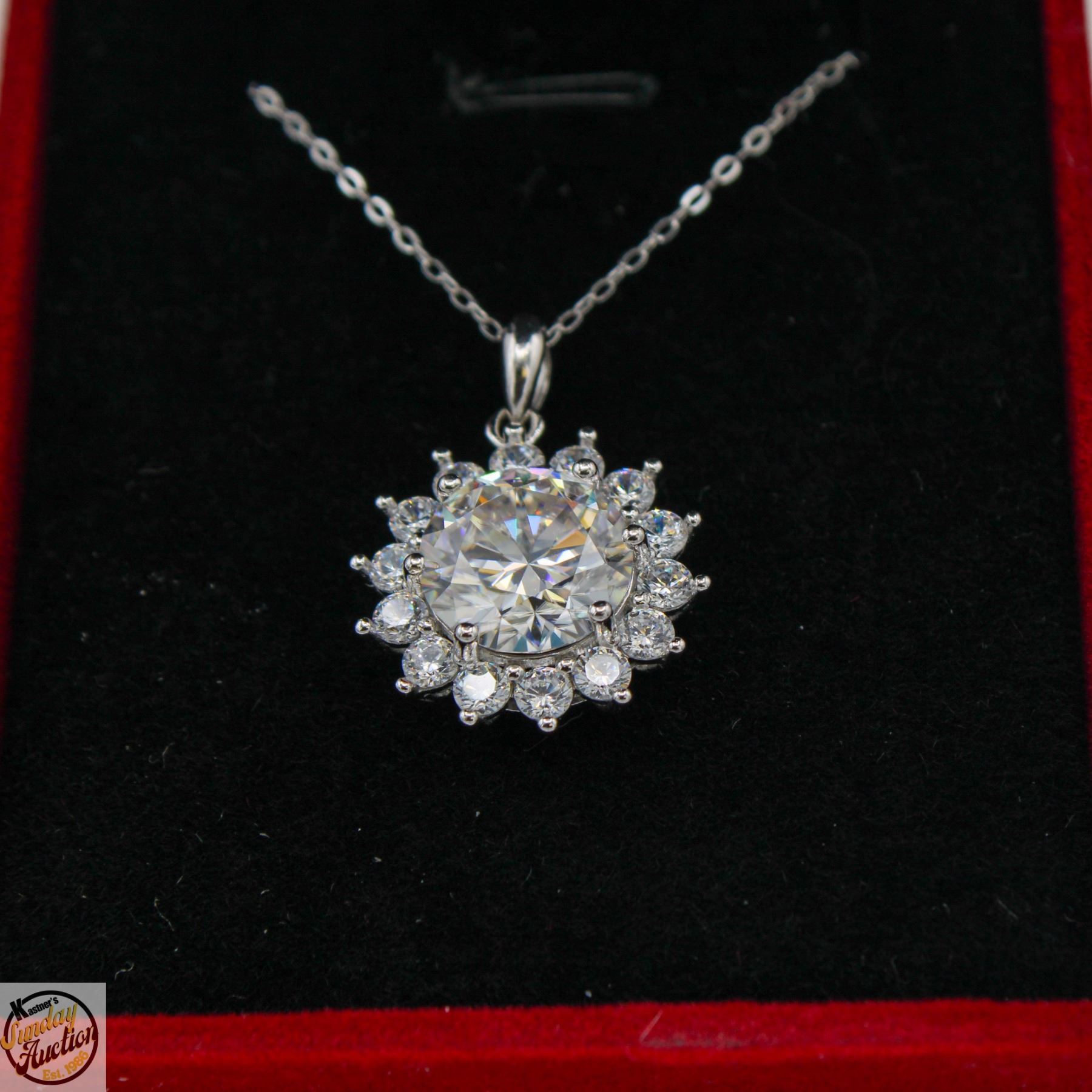 MOISSANITE STONE VVS D COLOR WITH 14 ROUND BRILLIANT CUT CUBIC ZIRCONIA SET AROUND CENTER SET IN 925 SILVER PENDANT RETAIL VALUE $1,375.00 **ALL ITEMS MUST BE REMOVED BY 5PM SATURDAY, SEPTEMBER 6TH 2025. ALL REMAINING ITEMS WILL BE SUBJECT TO A $6.00 PER DAY STORAGE CHARGE. ANY ITEMS REMAINING AFTER MONDAY, SEPTEMBER 22ND 2025 WILL BE CONSIDERED FORFEITED. NO REFUNDS WILL BE ISSUED FOR FORFEITED ITEMS. TO SCHEDULE A PICK UP APPOINTMENT CLICK HERE