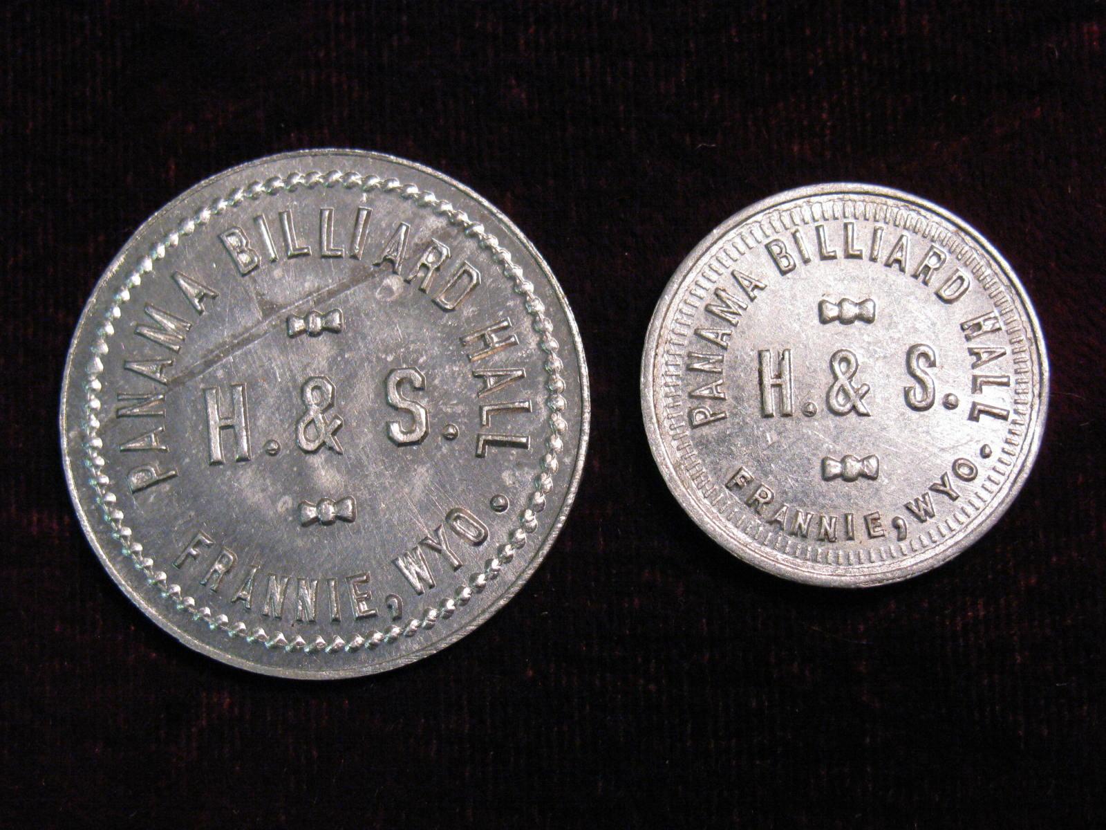 3076. Panama Billiard Hall Frannie, Wyo. 5c, 25c Tokens.