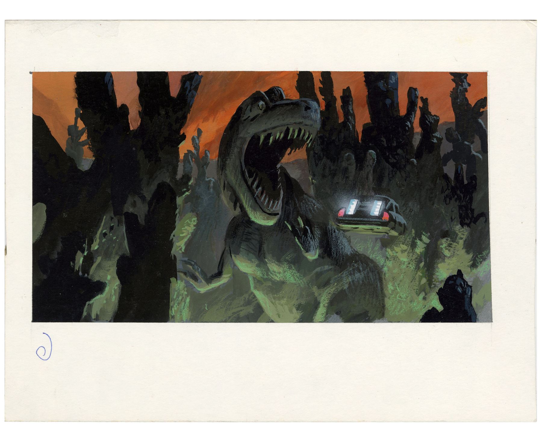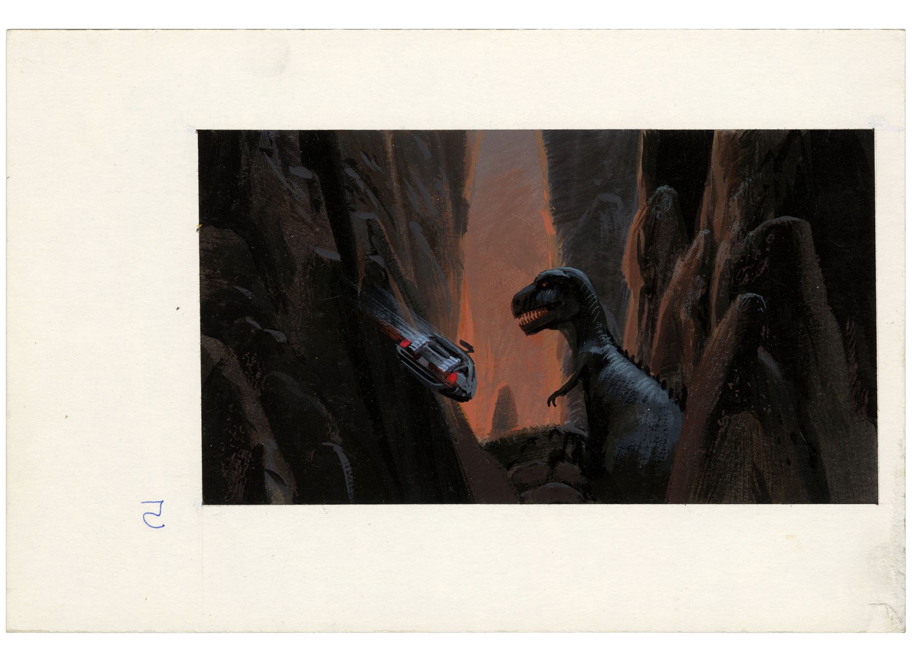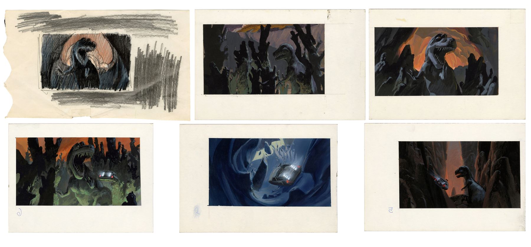 This lot comes from the collection of Trumbull. It consists of five hand-painted production illustrations of the DeLorean traveling into the age of dinosaurs rendered in mixed media on illustration board as well as one sketch of a large dinosaur attacking the vehicle rendered in mixed media on paper. This lot exhibits grime on the boards, as well as minor tears on the sketch's edges. Dimensions: (largest) 9" x 6" x 0.25" (15.25 cm x 23 cm x 0.75 cm)