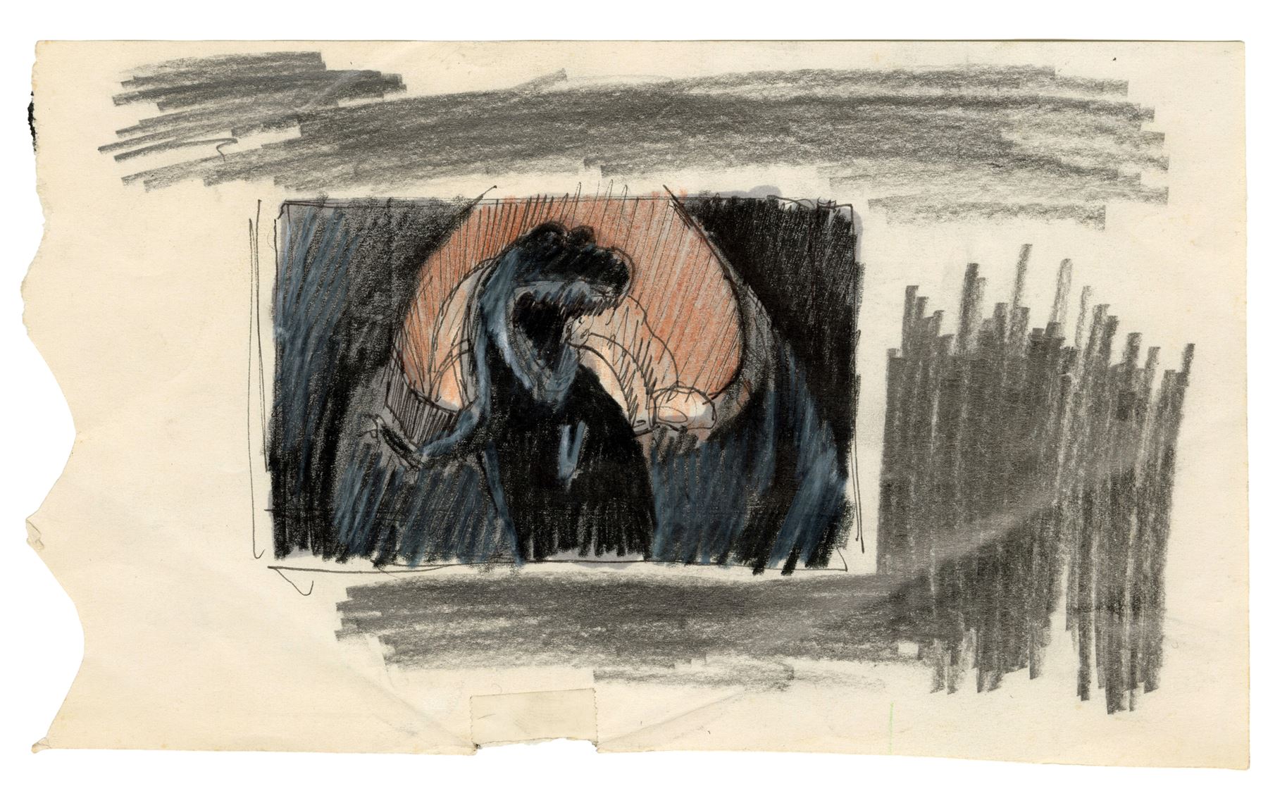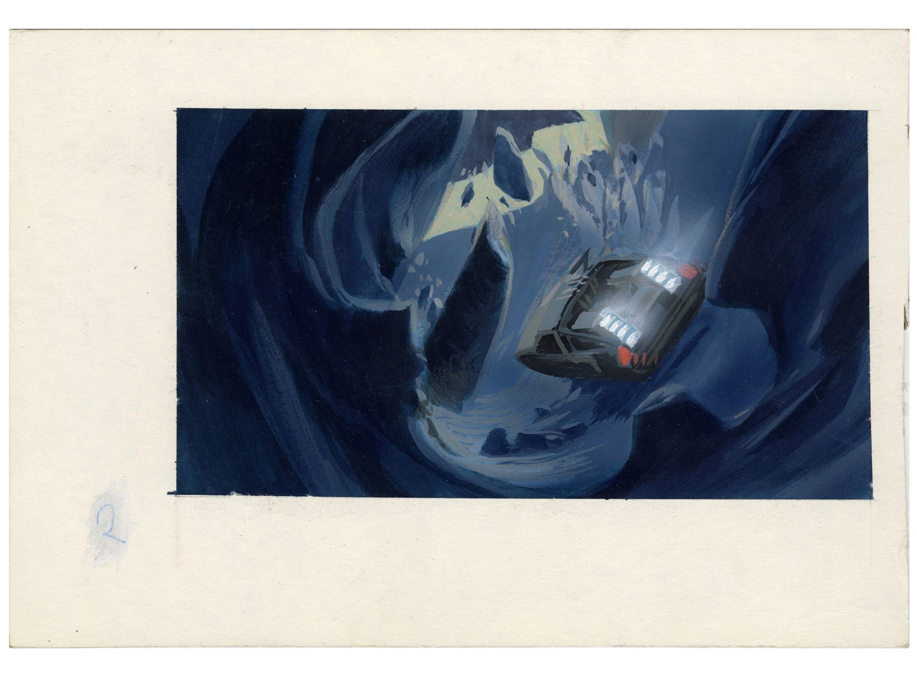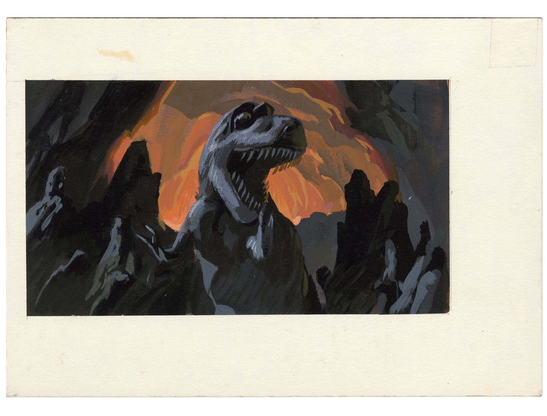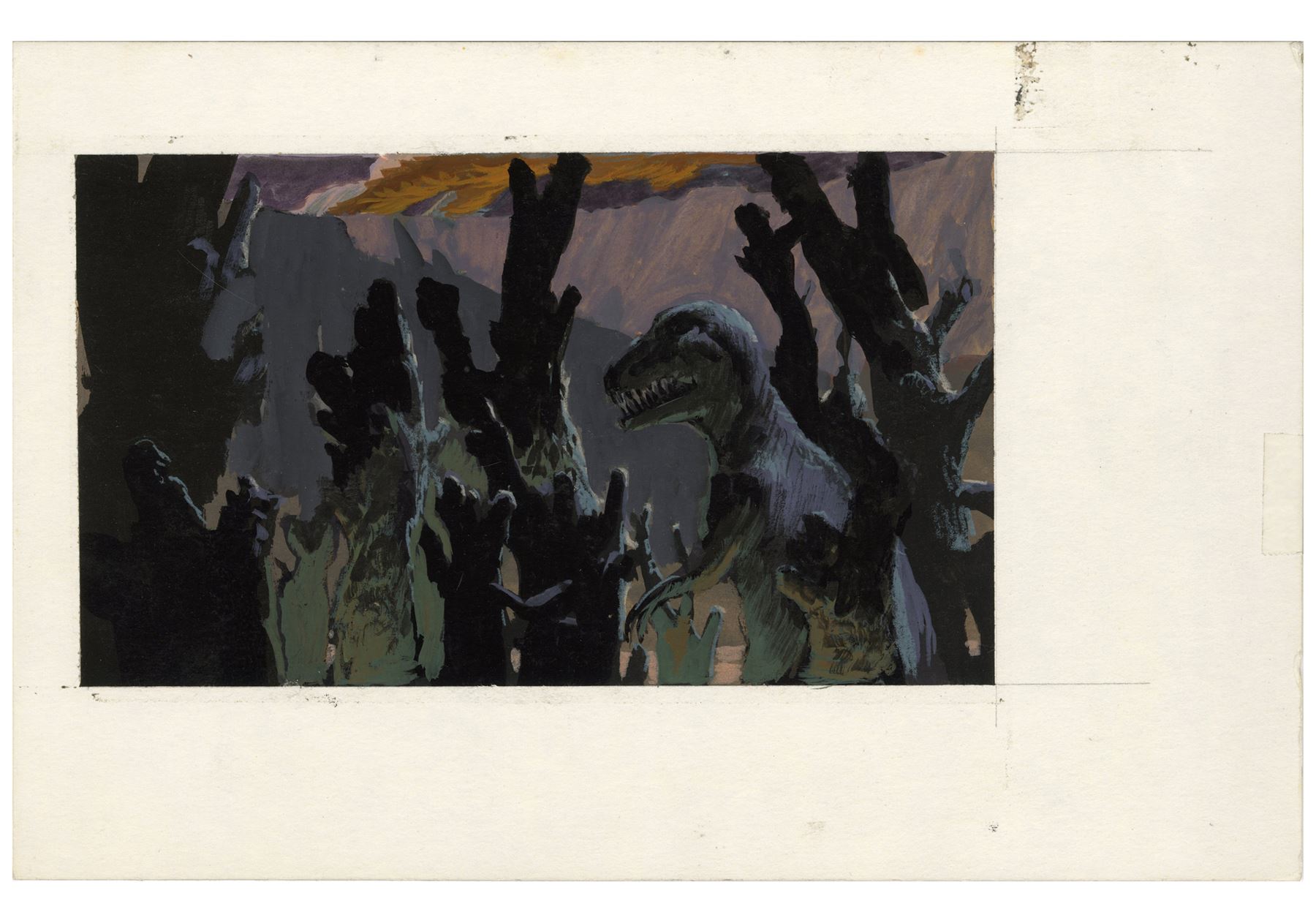 This lot comes from the collection of Trumbull. It consists of five hand-painted production illustrations of the DeLorean traveling into the age of dinosaurs rendered in mixed media on illustration board as well as one sketch of a large dinosaur attacking the vehicle rendered in mixed media on paper. This lot exhibits grime on the boards, as well as minor tears on the sketch's edges. Dimensions: (largest) 9" x 6" x 0.25" (15.25 cm x 23 cm x 0.75 cm)