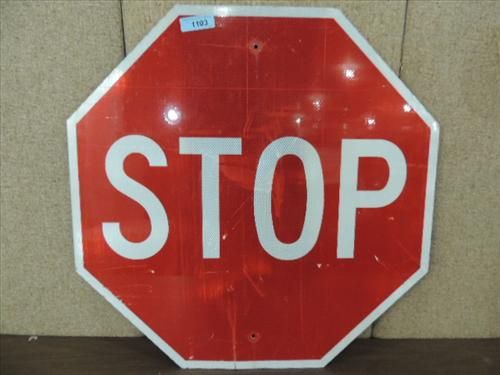 30X30 OCTAGON REFLECTIVE ALUMINUM STOP SIGN. TAGGED AS DECOMMISSIONED SIGN. AS SHOWN. VIEW PICTURE FOR DETAIL.