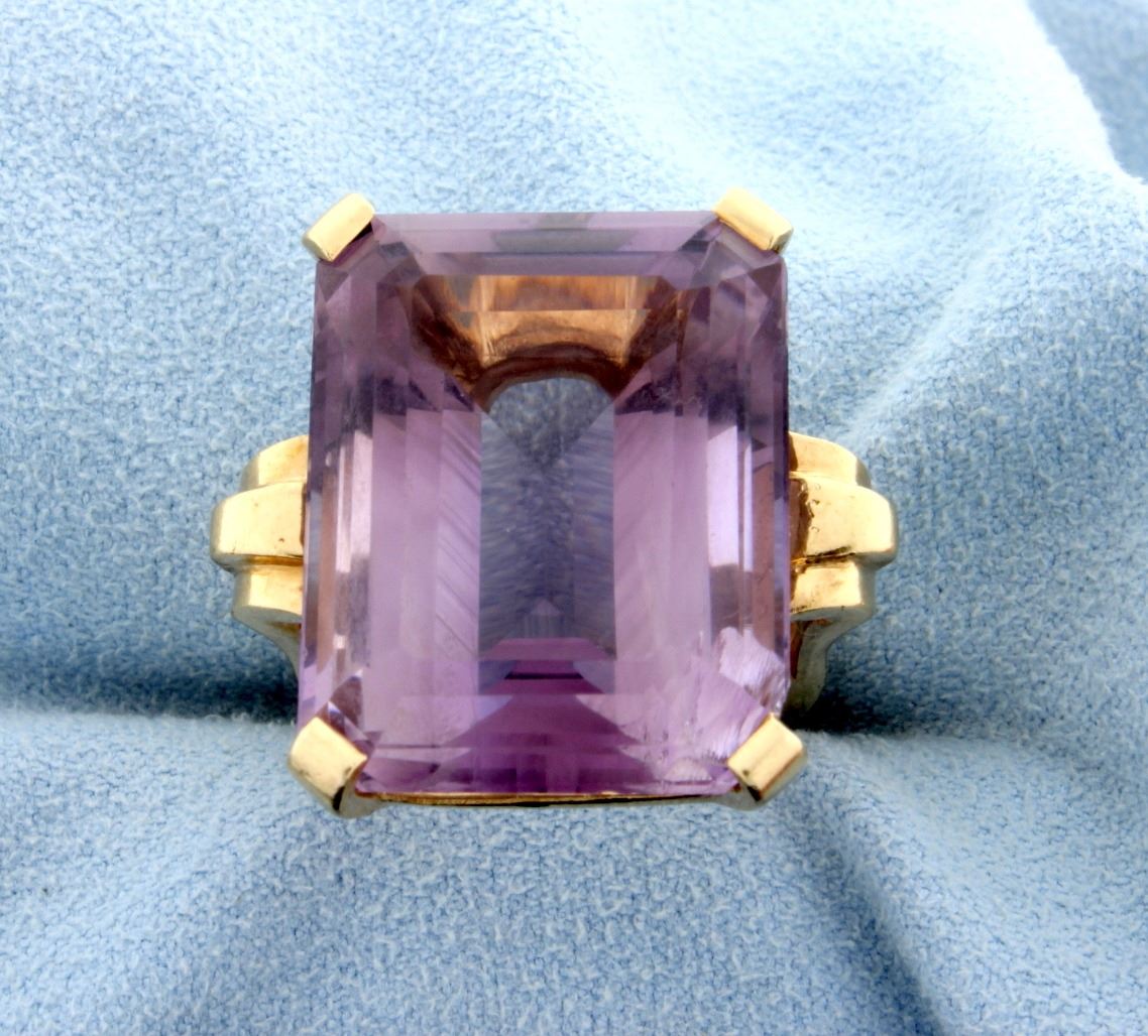 In 14K yellow gold the ring contains a 23.5x18mm emerald cut amethyst gemstone that has excellent color & clarity. There is a small chip on the underside of the amethyst in the corner that is mostly covered up by the prong and does not take away from the beauty of the ring. Size 6 3/4 18.8g