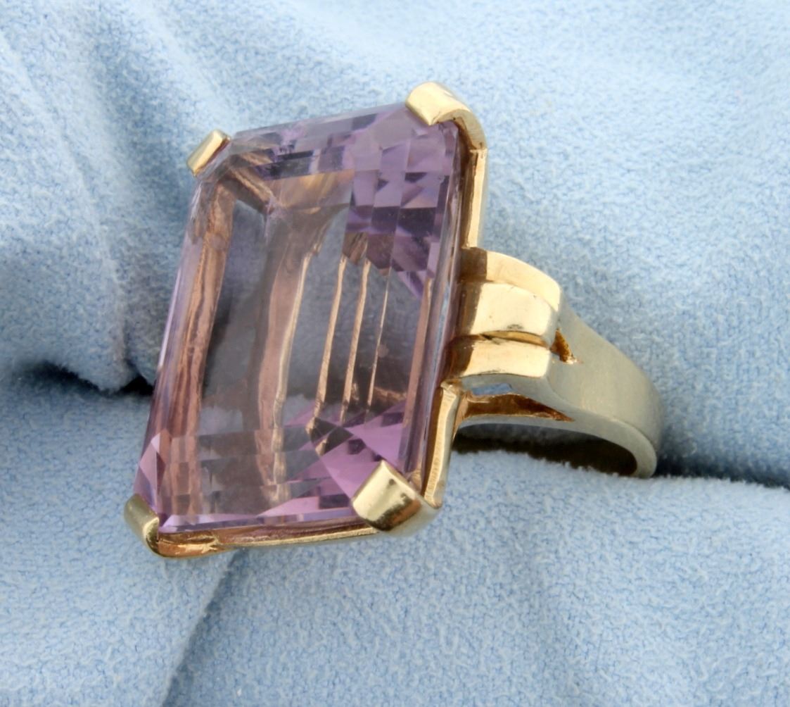 In 14K yellow gold the ring contains a 23.5x18mm emerald cut amethyst gemstone that has excellent color & clarity. There is a small chip on the underside of the amethyst in the corner that is mostly covered up by the prong and does not take away from the beauty of the ring. Size 6 3/4 18.8g