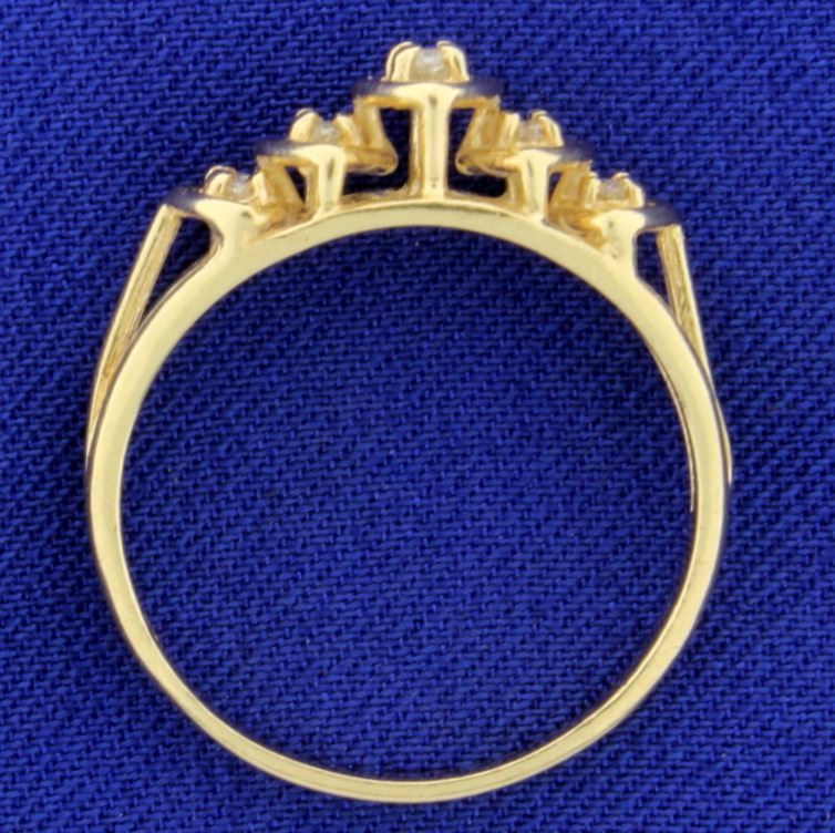 In 14K yellow gold, the center is a very high quality .10ct marquise diamonds with four .05ct marquise diamonds, two on either side - all VS clarity/G color. Size 9 1/4 3.3g