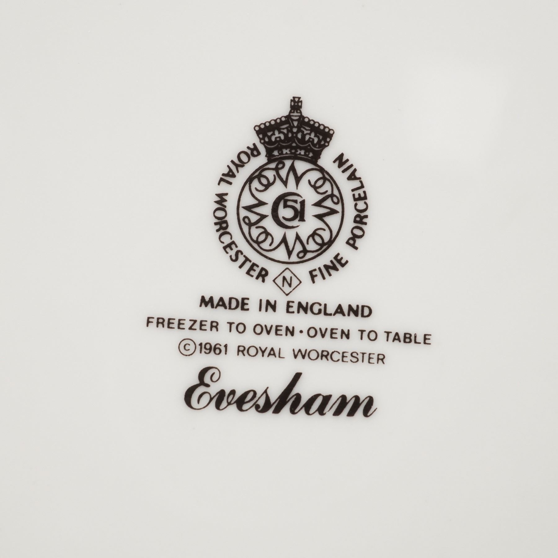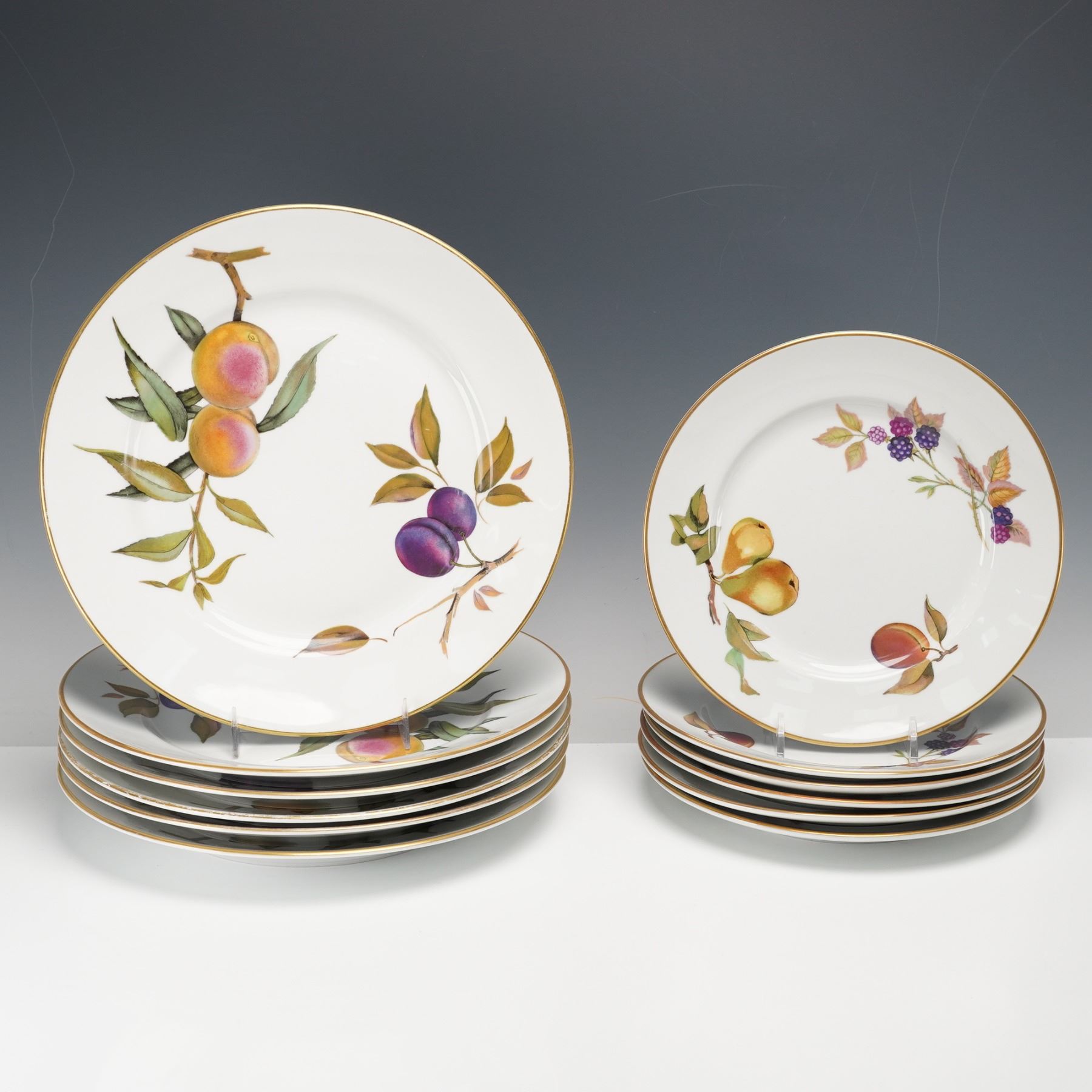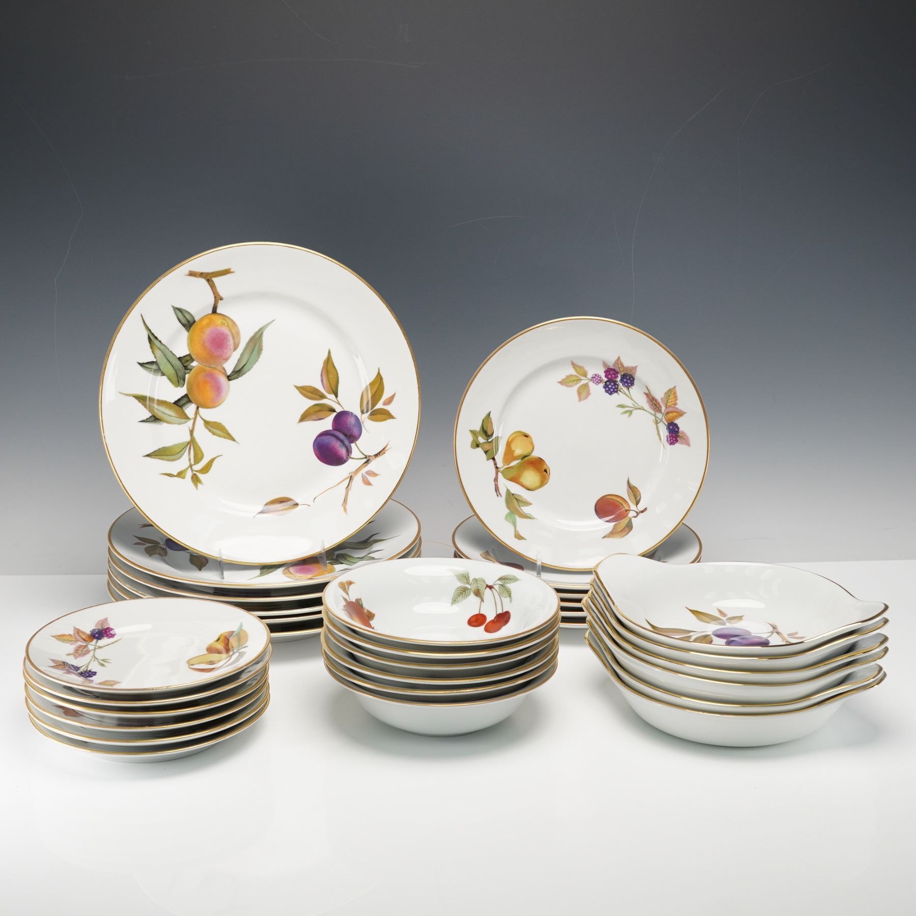 A 30-piece dinner service for six, including six dinner plates, six salad plates, six bread and butter plates, six soup or cereal bowls, and six eared round egg dishes. Each piece decorated with assorted fruit motifs on a white ground with gold trim. All items bear the Royal Worcester Fine Porcelain Evesham backstamp.