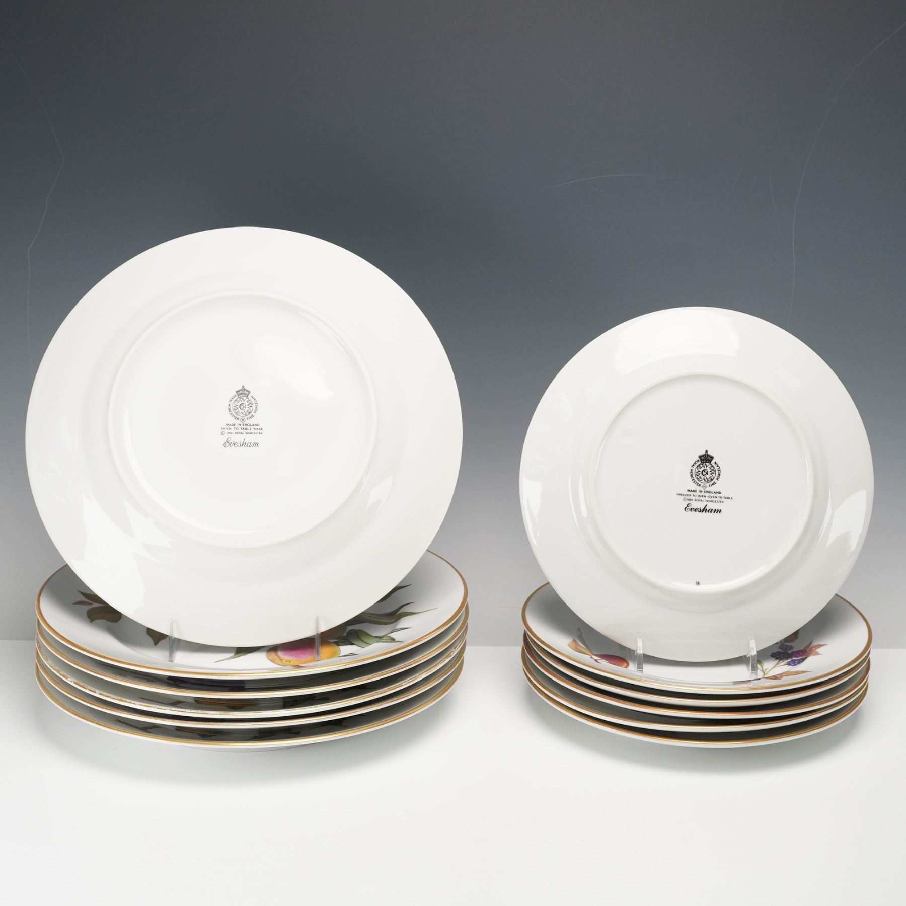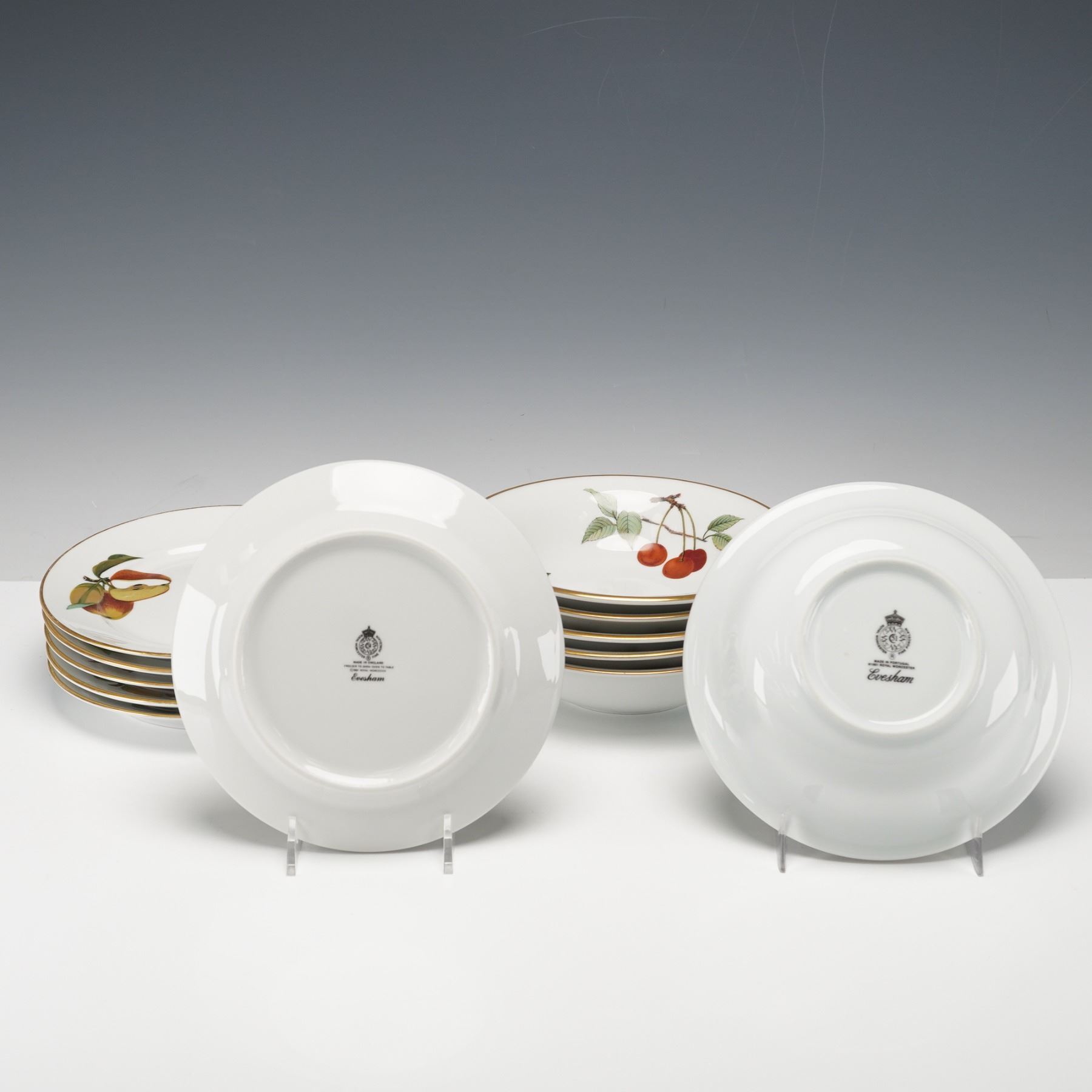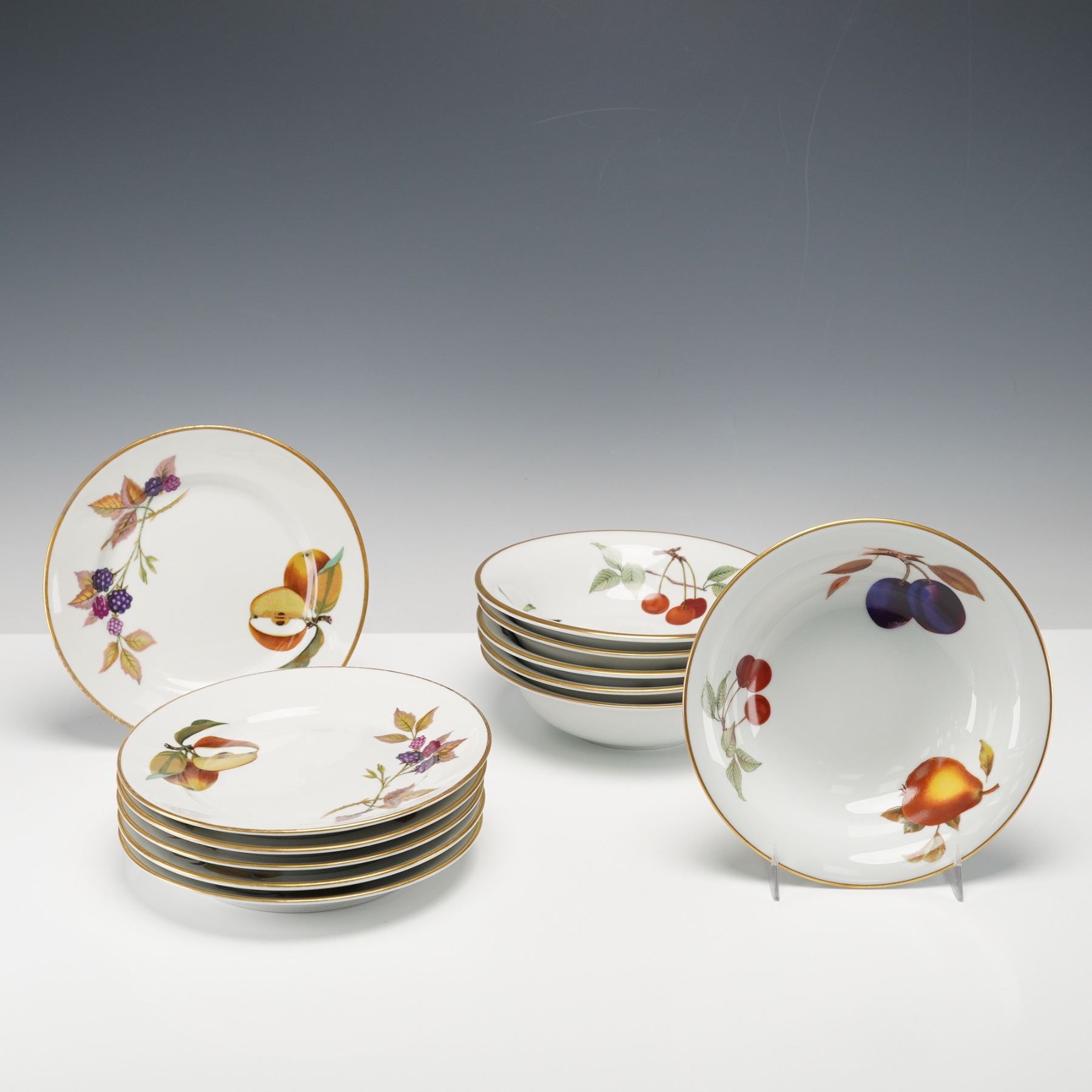 A 30-piece dinner service for six, including six dinner plates, six salad plates, six bread and butter plates, six soup or cereal bowls, and six eared round egg dishes. Each piece decorated with assorted fruit motifs on a white ground with gold trim. All items bear the Royal Worcester Fine Porcelain Evesham backstamp.