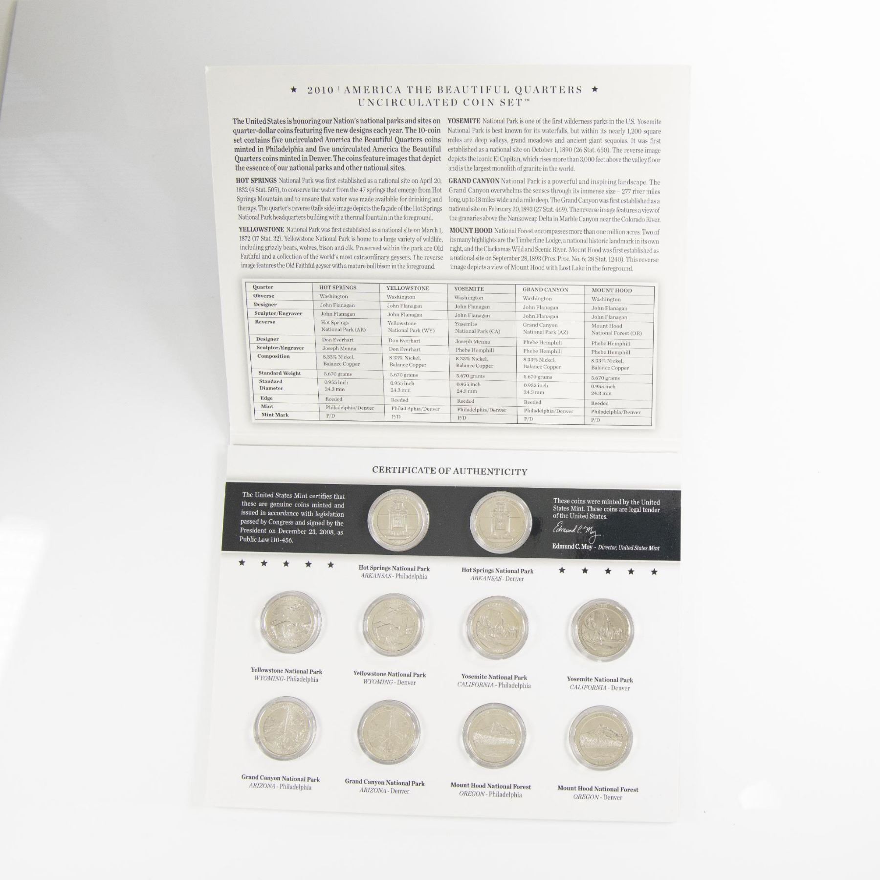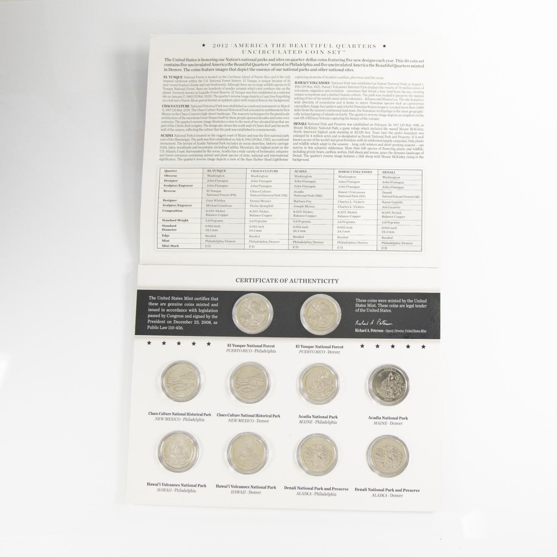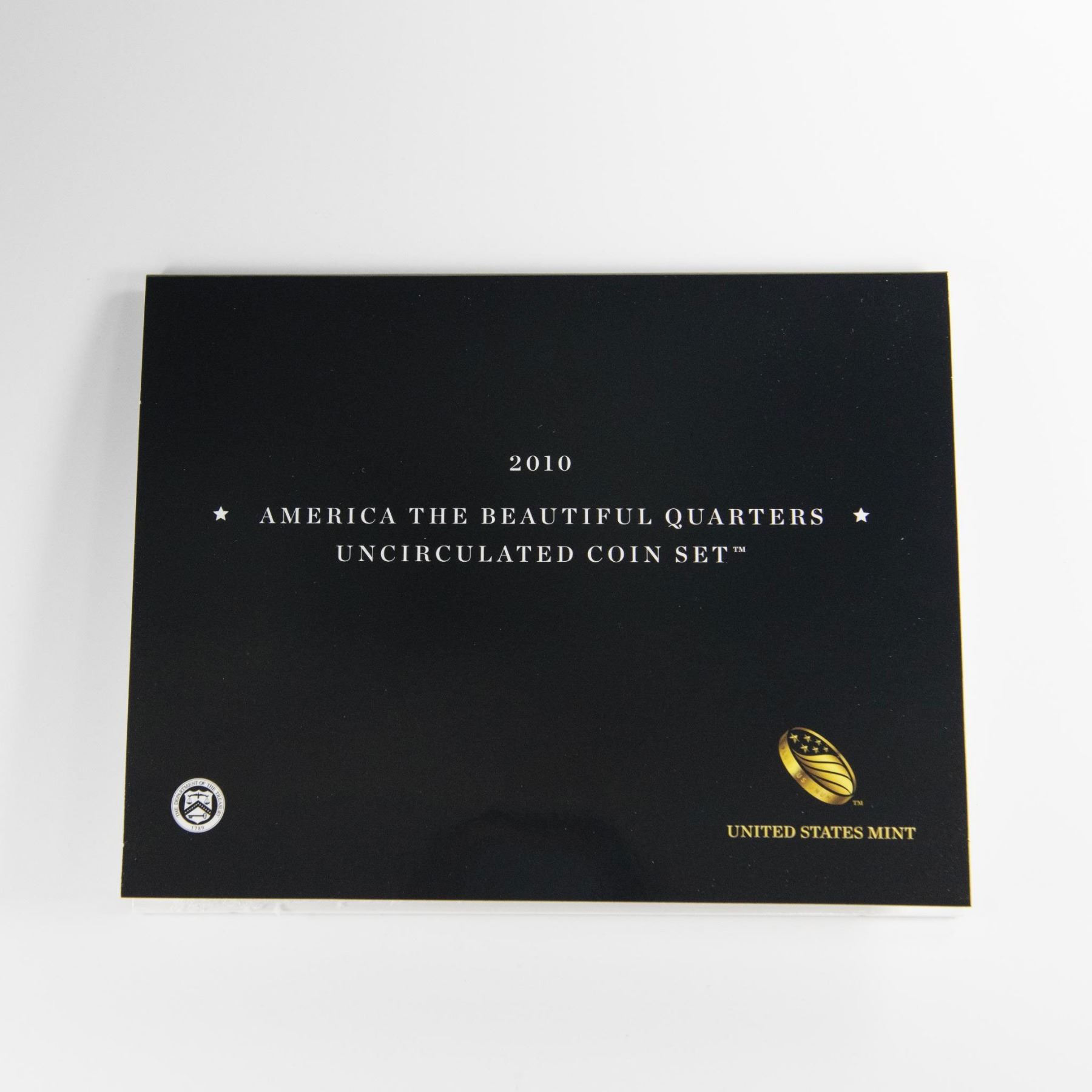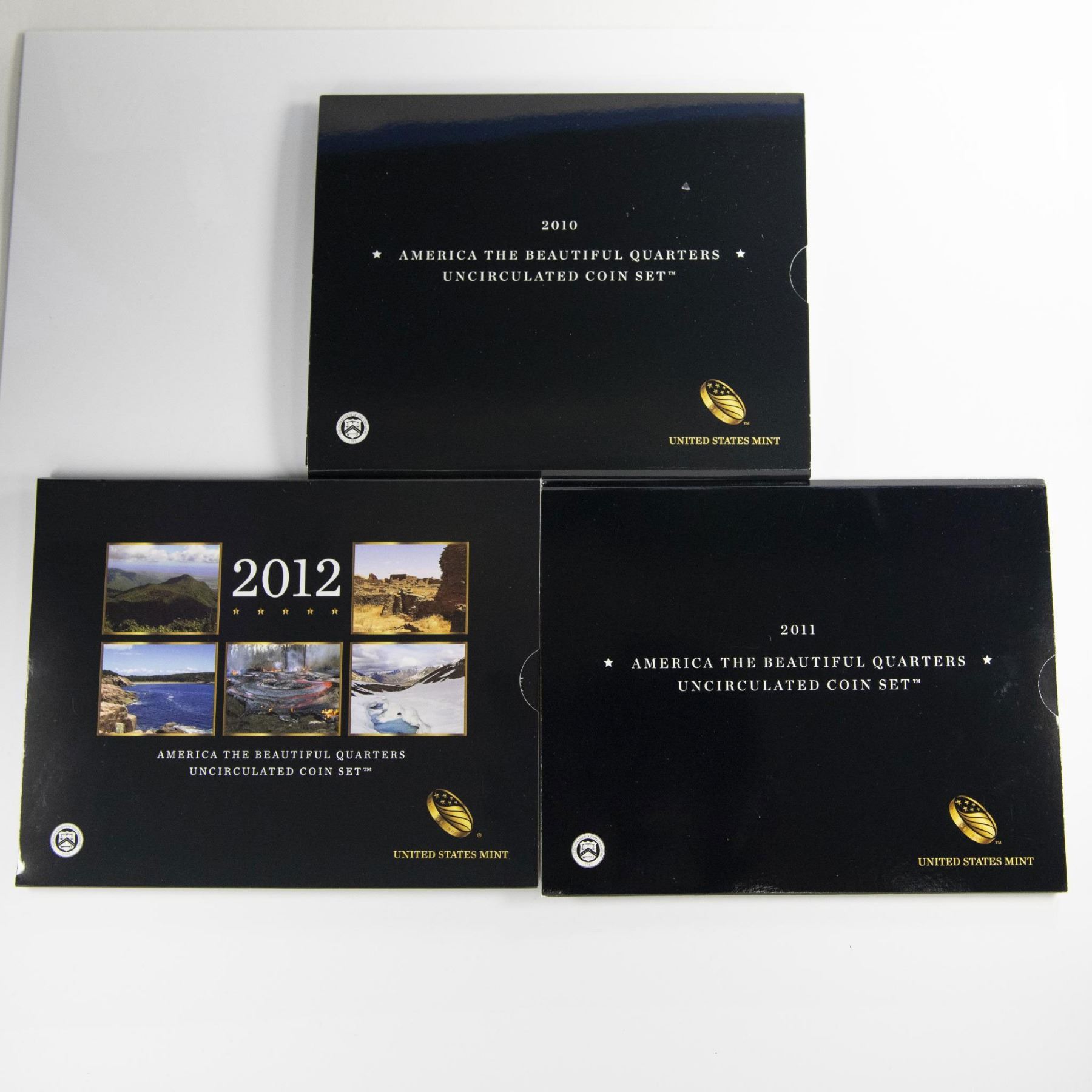 Collection includes 3 original United States Mint packaging for 2010, 2011 and 2012. Each package contains 10 America the Beautiful Quarters. Of which from those 10 quarters, 5 are Uncirculated Philadelphia Mint, and 5 Uncirculated Denver Mint. 2010 quarters reverse side depicts US National Parks: Hot Springs from Arkansas; Yellowstone from Wyoming; Yosemite from California; Grand Canyon from Arizona; and Mount Hood from Oregon. 2011 quarters reverse side shows: Gettysburg from Pennsylvania; Glacier from Montana; Olympic from Washington; Vicksburg from Mississippi; and Chickasaw from Oklahoma. 2012 quarters reverse side features: El Yunque from Puerto Rico; Chaco Culture from New Mexico; Acadia from Maine; Hawaii Volcanoes from Hawaii; and Denali from Alaska. Each coin is in a protective case and displayed in the US Mint packaging. The packaging is approximately: 8.25"L x 0.25"W x 6.5"H.