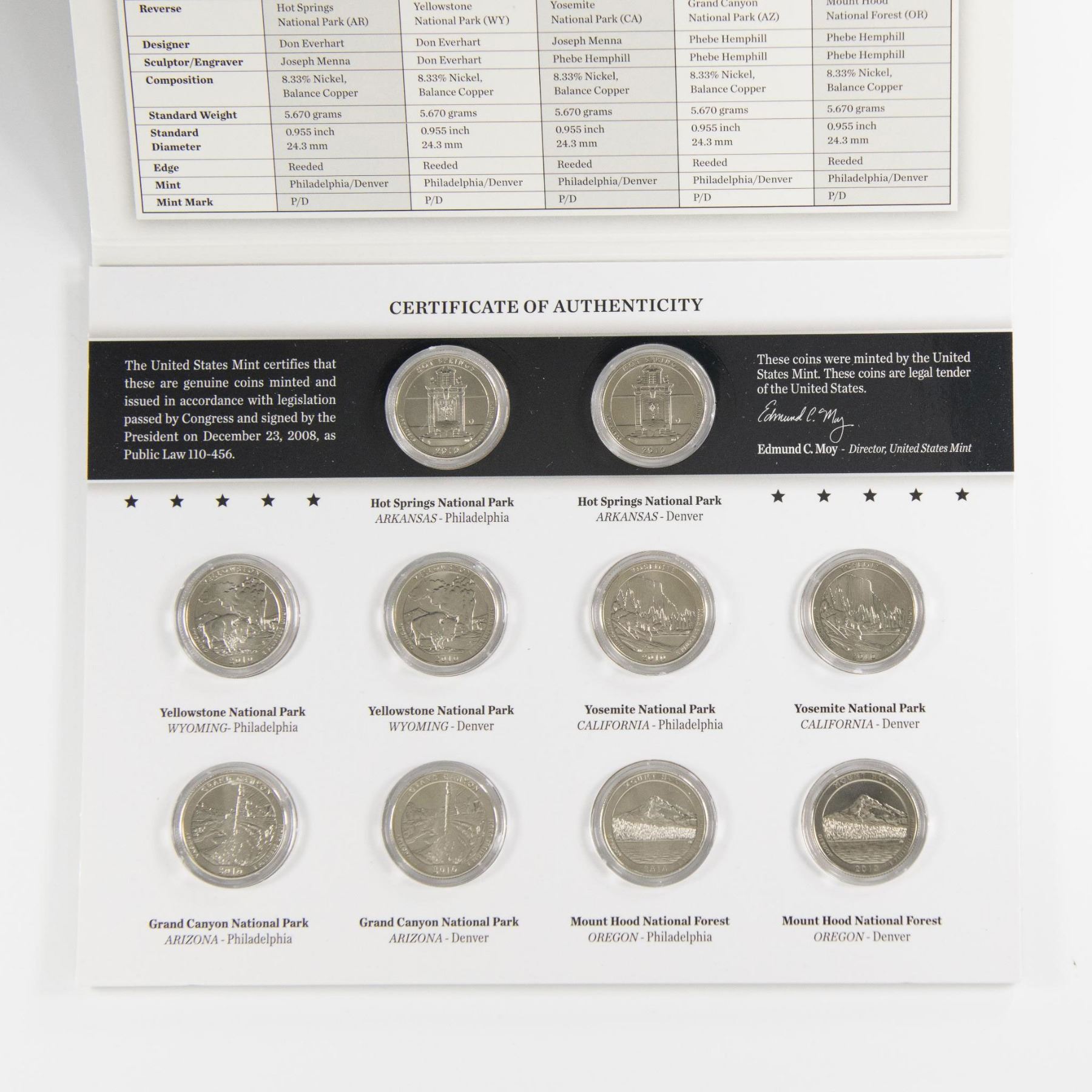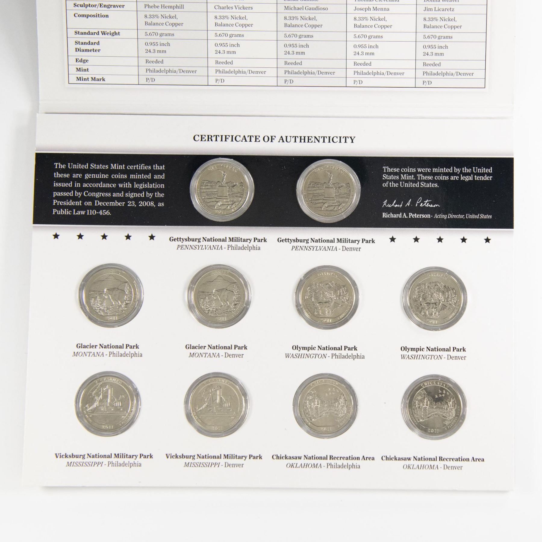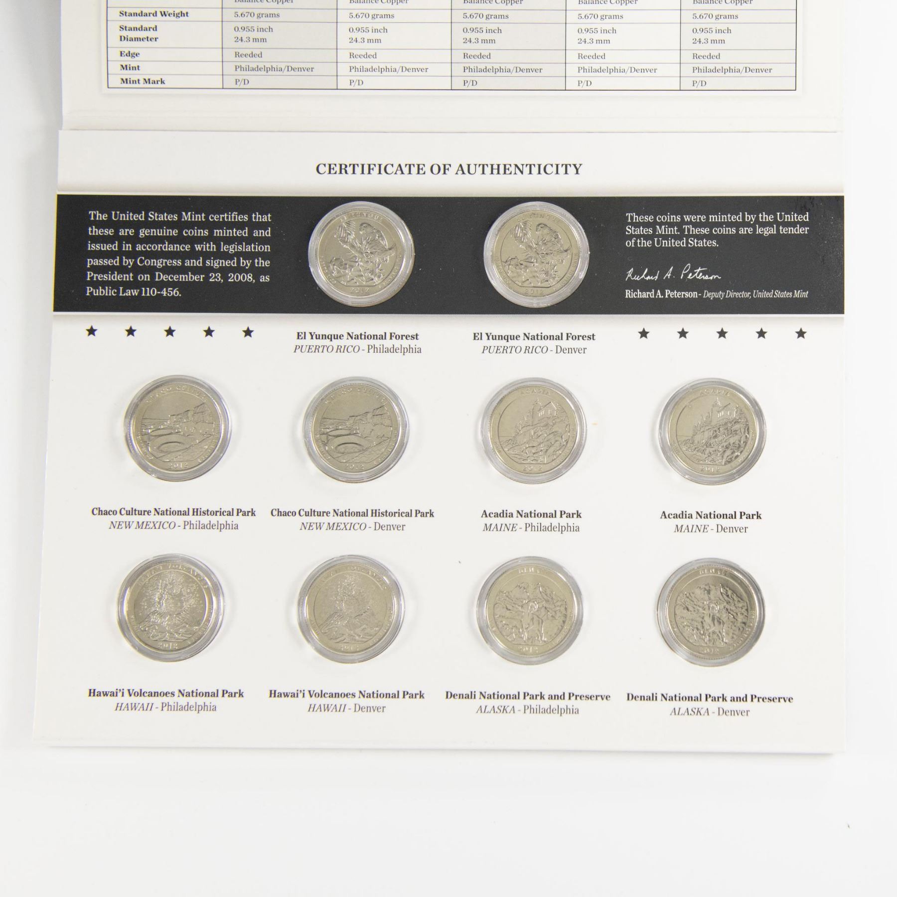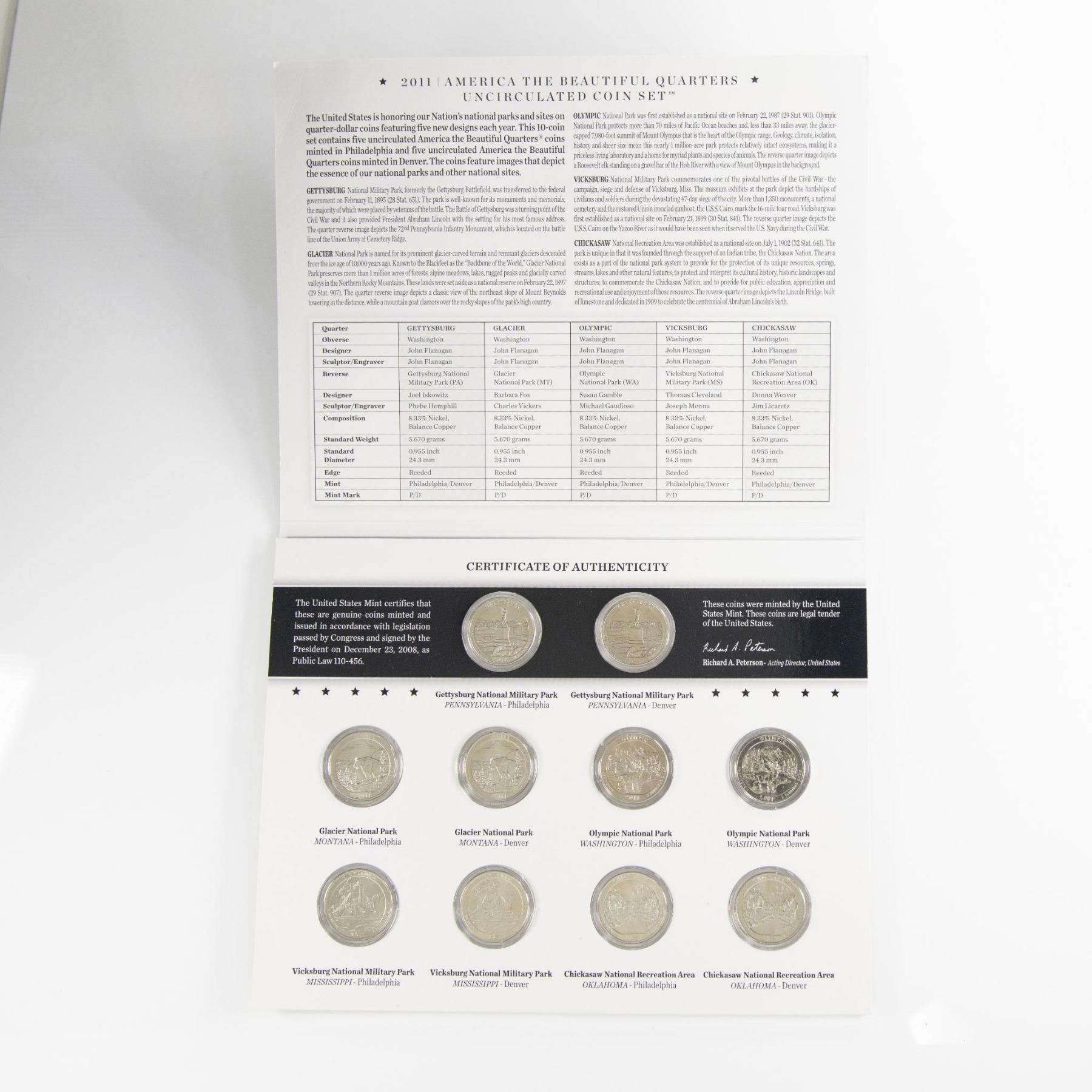 Collection includes 3 original United States Mint packaging for 2010, 2011 and 2012. Each package contains 10 America the Beautiful Quarters. Of which from those 10 quarters, 5 are Uncirculated Philadelphia Mint, and 5 Uncirculated Denver Mint. 2010 quarters reverse side depicts US National Parks: Hot Springs from Arkansas; Yellowstone from Wyoming; Yosemite from California; Grand Canyon from Arizona; and Mount Hood from Oregon. 2011 quarters reverse side shows: Gettysburg from Pennsylvania; Glacier from Montana; Olympic from Washington; Vicksburg from Mississippi; and Chickasaw from Oklahoma. 2012 quarters reverse side features: El Yunque from Puerto Rico; Chaco Culture from New Mexico; Acadia from Maine; Hawaii Volcanoes from Hawaii; and Denali from Alaska. Each coin is in a protective case and displayed in the US Mint packaging. The packaging is approximately: 8.25"L x 0.25"W x 6.5"H.