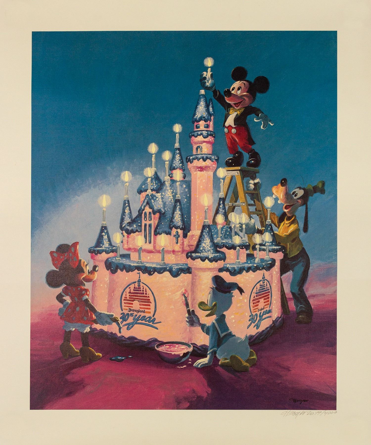 (Disneyland, 1985) A beautiful lithograph by Charles Boyer, created to commemorate the 30th anniversary of Disneyland. The 24.5"x21" lithograph is titled "30th Anniversary" and is signed by Boyer in the bottom-right corner. The lithograph is numbered 2,079/4,000 and comes with a Certificate of Authenticity. It is in fair condition with some edge-wear.