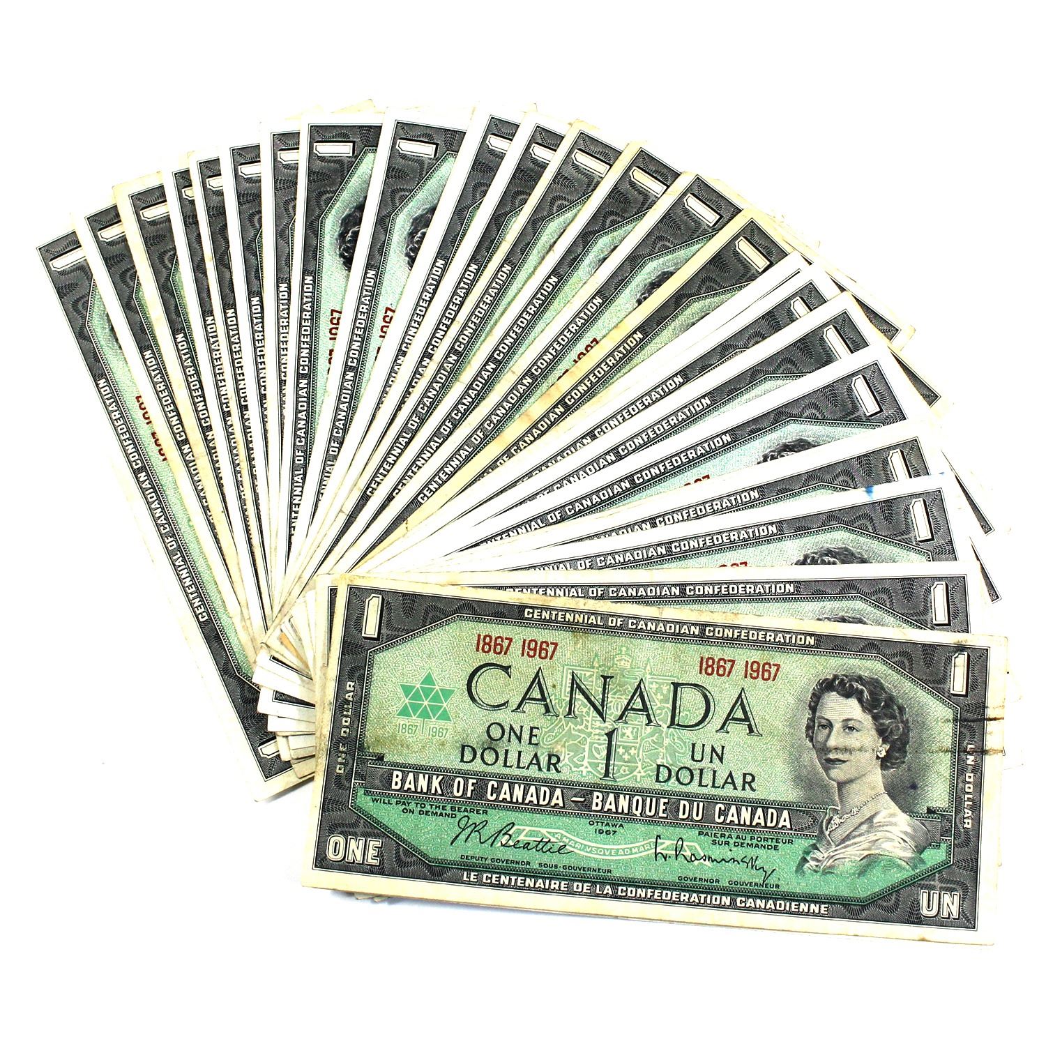 30x 1967 Bank of Canada $1 Centennial Commemorative No Serial Number Notes in Average Condition. 30pcs