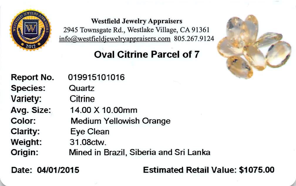 Seven oval mixed cut natural citrine quartzs exact total weight 31.08ct., clarity is eye clean, type I, medium, brownish, yellowish orange color, (GIA yO 5/3), cut is good. Westfield Appraised at $1,075.00.