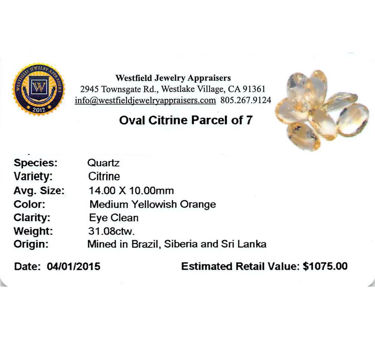 Seven oval mixed cut natural citrine quartzs exact total weight 31.08ct., clarity is eye clean, type I, medium, brownish, yellowish orange color, (GIA yO 5/3), cut is good. Westfield Appraised at $1,075.00.