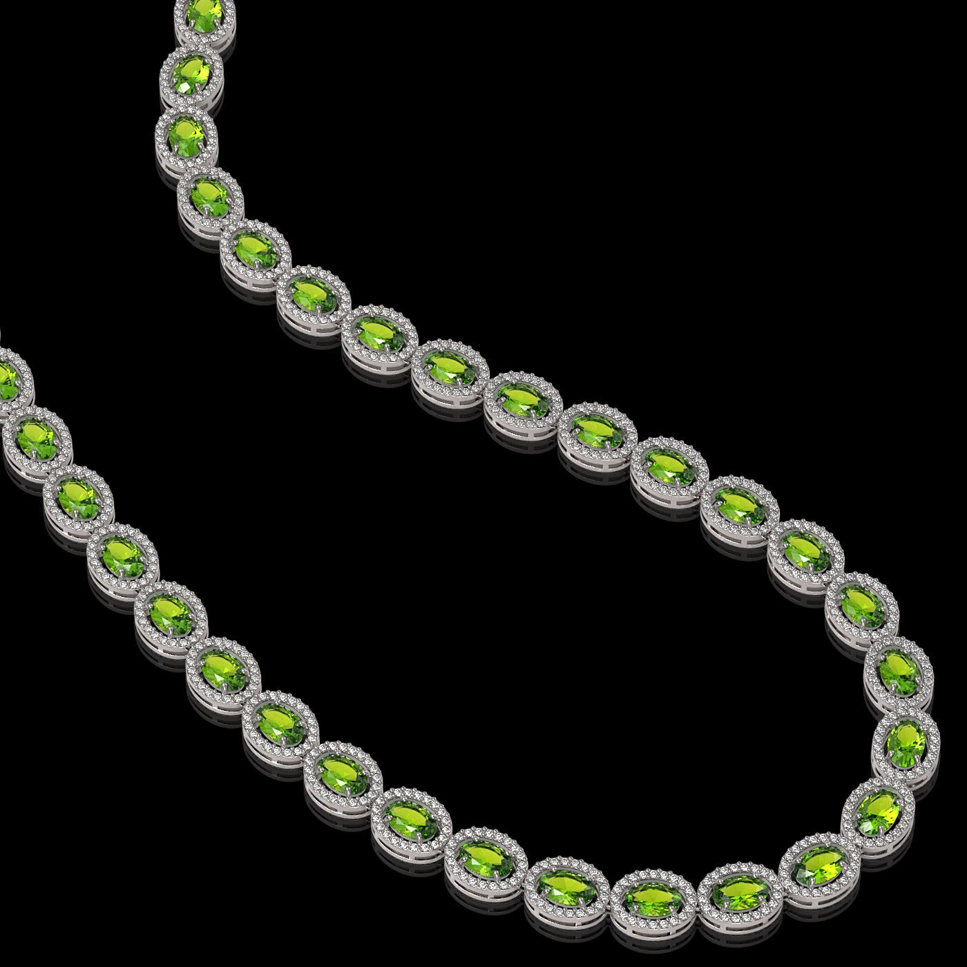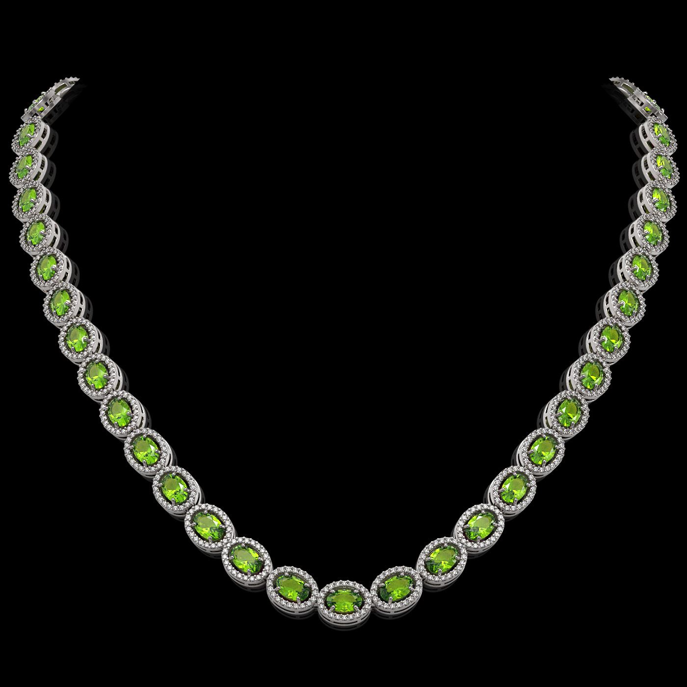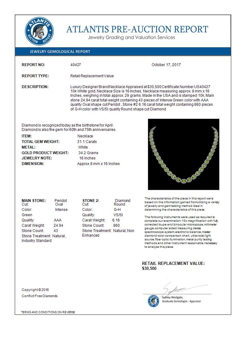 REF-554A8X -40427 ---- 31.1 CTW Peridot & Diamond Halo Necklace 10K White Gold ---- Luxury Designer Brand Necklace Appraised at $30,500 Certificate Number US40427 10k White gold, Necklace Size is 16 Inches, Necklace measuring approx. 8 mm x 16 Inches, weighing in total approx. 29 grams. Made in the USA and is stamped 10k, Main stone 24.94 carat total weight containing 43 pieces of Intense Green color with AAA quality Oval shape cut Peridot , Stone #2 6.16 carat total weight containing 860 pieces of G-H color with VS/SI quality Round shape cut Diamond