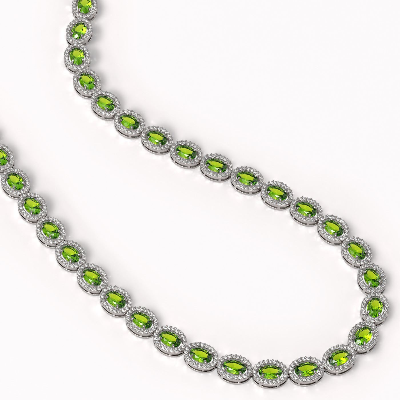 REF-554Y8K -40427 ---- 31.1 CTW Peridot & Diamond Halo Necklace 10K White Gold ---- Luxury Designer Brand Necklace Appraised at $30,500 Certificate Number US40427 10k White gold, Necklace Size is 16 Inches, Necklace measuring approx. 8 mm x 16 Inches, weighing in total approx. 29 grams. Made in the USA and is stamped 10k, Main stone 24.94 carat total weight containing 43 pieces of Intense Green color with AAA quality Oval shape cut Peridot , Stone #2 6.16 carat total weight containing 860 pieces of G-H color with VS/SI quality Round shape cut Diamond