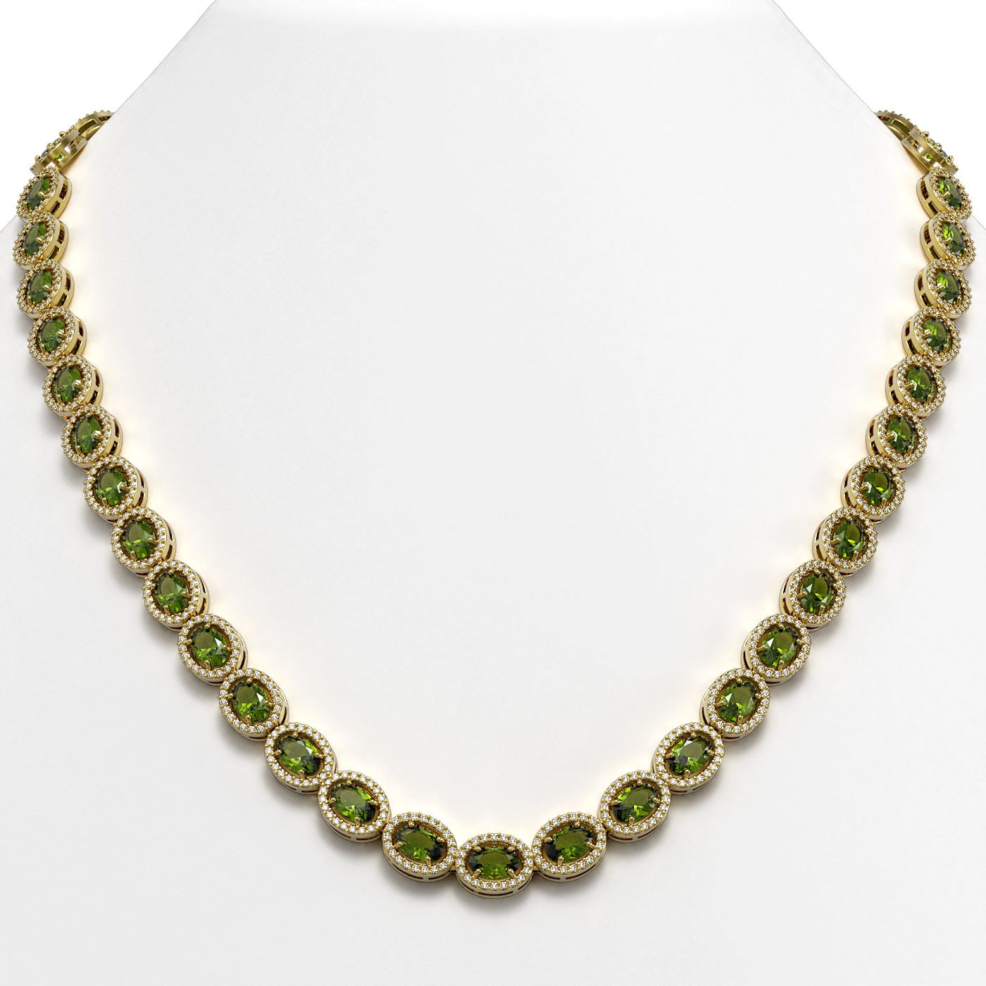 REF-600A2X -40423 ---- 31.1 CTW Tourmaline & Diamond Halo Necklace 10K Yellow Gold ---- Luxury Designer Brand Necklace Appraised at $33,000 Certificate Number US40423 10k Yellow gold, Necklace Size is 16 Inches, Necklace measuring approx. 8 mm x 16 Inches, weighing in total approx. 29 grams. Made in the USA and is stamped 10k, Main stone 24.94 carat total weight containing 43 pieces of Translucent Medium Green color with AAA quality Oval shape cut Tourmaline , Stone #2 6.16 carat total weight containing 860 pieces of G-H color with VS/SI quality Round shape cut Diamond
