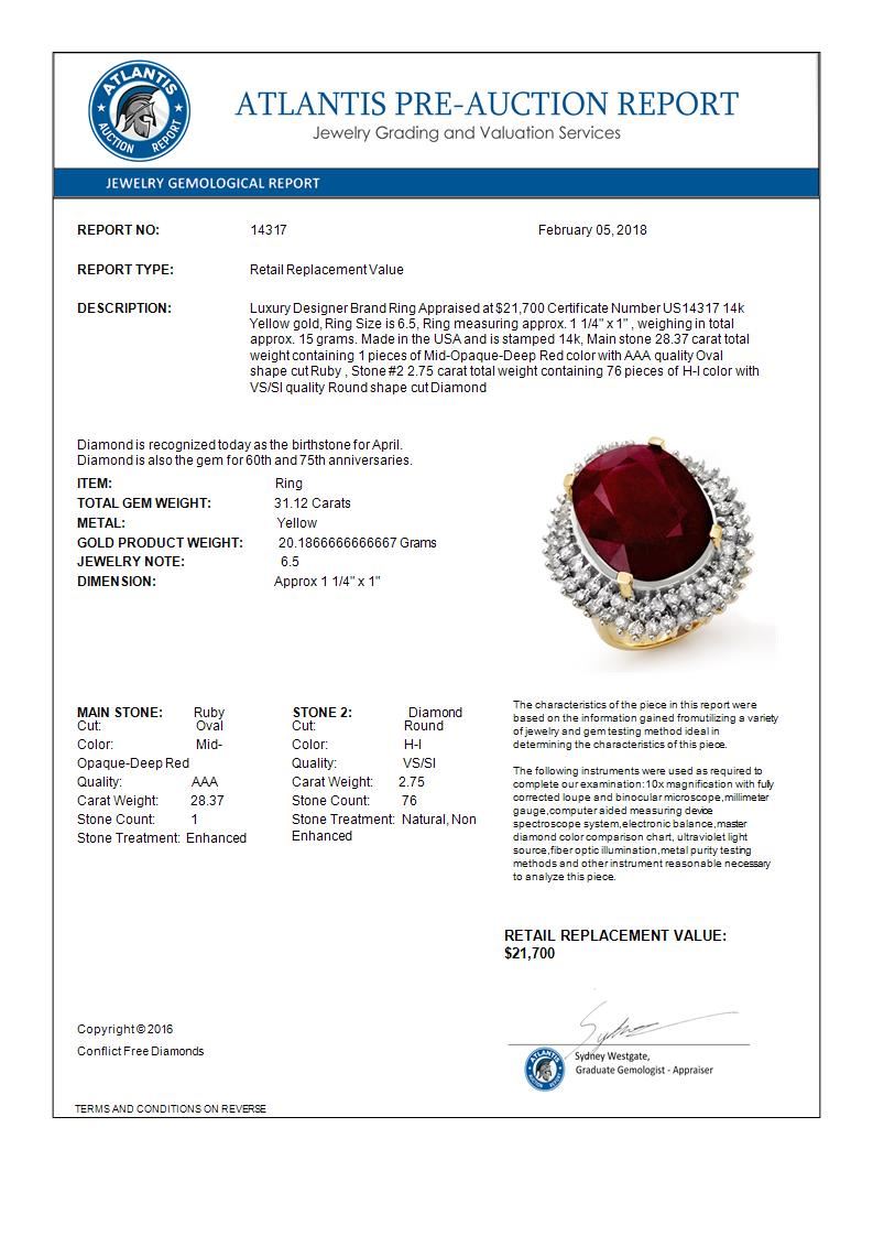 REF-303K8W -14317 ---- 31.12 CTW Ruby & Diamond Ring 14K Yellow Gold ---- Luxury Designer Brand Ring Appraised at $21,700 Certificate Number US14317 14k Yellow gold, Ring Size is 6.5, Ring measuring approx. 1 1/4" x 1" , weighing in total approx. 15 grams. Made in the USA and is stamped 14k, Main stone 28.37 carat total weight containing 1 pieces of Mid-Opaque-Deep Red color with AAA quality Oval shape cut Ruby , Stone #2 2.75 carat total weight containing 76 pieces of H-I color with VS/SI quality Round shape cut Diamond