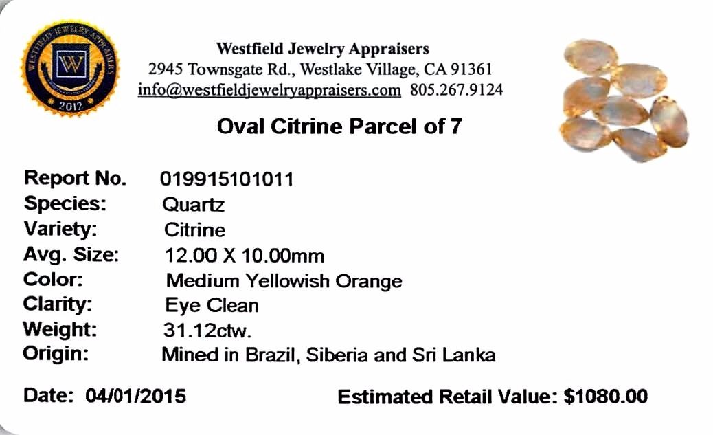 Seven oval mixed cut natural citrine quartzs exact total weight 31.12ct., clarity is eye clean, type I, medium, slightly brownish, yellowish orange color, (GIA yO 5/2), cut is good. Westfield Appraised at $1,080.00.