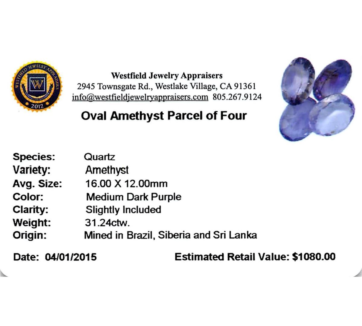 Four oval mixed cut natural amethysts exact total weight 31.24ct., clarity is slightly included, type II, medium dark, very slightly grayish, purple color, (GIA P 6/3), cut is good. Westfield Appraised at $1,080.00.