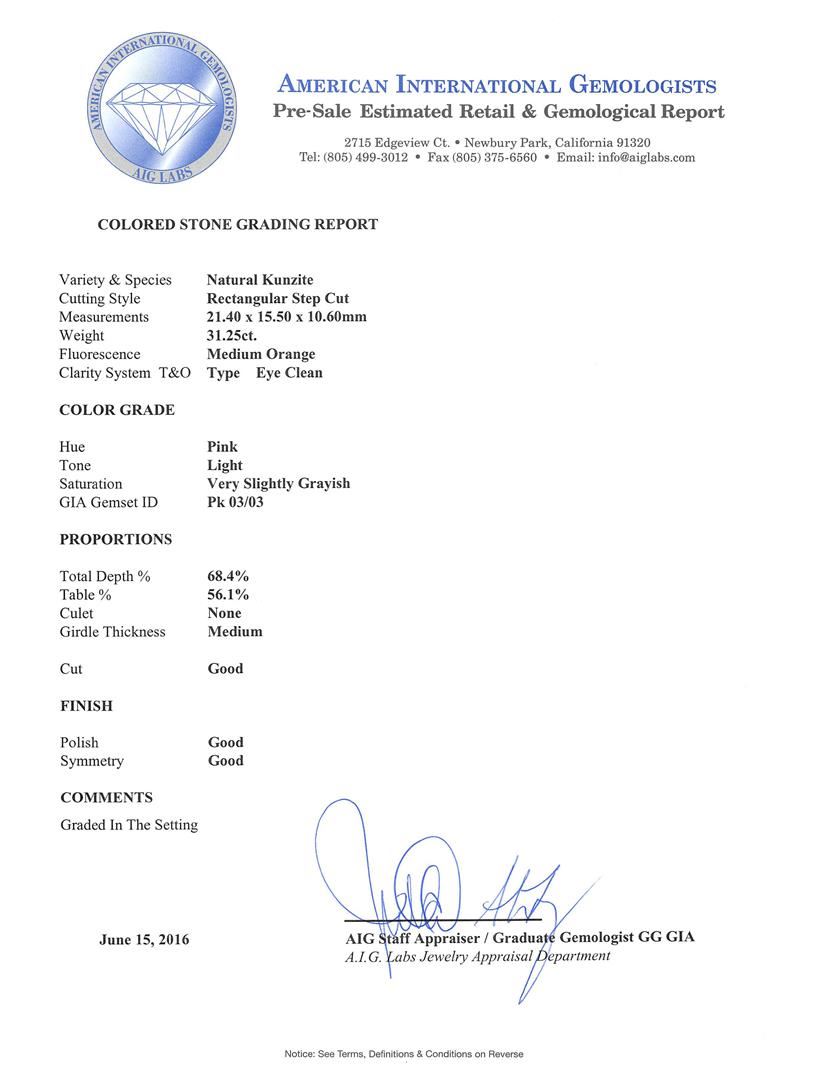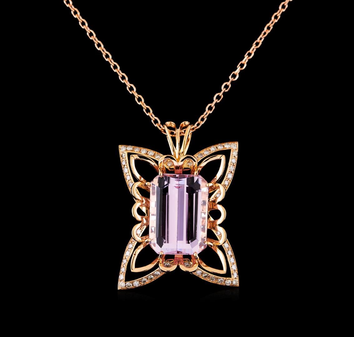 One electronically tested 14KT rose gold ladies cast & assembled kunzite and diamond pendant with chain. The pendant features a kunzite set within a tiered butterfly style diamond set bezel completed by a split bail. The pendant is supported by a twenty inch length 14KT rose gold cable chain, terminating in a lobster claw clasp. Bright polish finish. Condition is new, good workmanship. Containing: One prong set rectangular step cut natural kunzite, measuring 21.40 x 15.50 x 10.60mm, approximate weight of 31.25ct. with a medium Orange fluorescence, clarity is eye clean, light, very slightly grayish, pink color, (GIA Pk 3/3), cut is good. Transmitting light with no distortion, transparent. Colored Stone Grading Report attached. Graded in the setting. Sixty-Four prong set round brilliant cut diamonds, measuring 1.80 - 1.80 x 1.08mm (depth est.) approximate total weight of 64 Stones = 1.40ct. Color & clarity grade are an average for the group. Graded in the setting. Clarity: SI-2 to I-2. Color: G - H. Total Weight of Colored Stones 31.25ct. Total Weight of Diamonds 1.40ct. Total Weight of Pendant With Chain 26.69gm. AIG Appraised at $15,775.00.