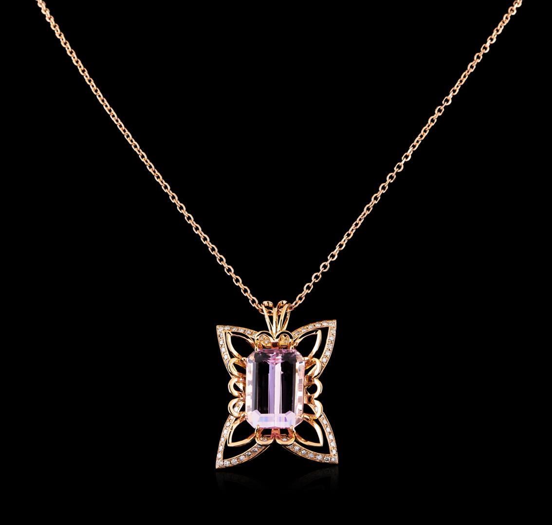 One electronically tested 14KT rose gold ladies cast & assembled kunzite and diamond pendant with chain. The pendant features a kunzite set within a tiered butterfly style diamond set bezel completed by a split bail. The pendant is supported by a twenty inch length 14KT rose gold cable chain, terminating in a lobster claw clasp. Bright polish finish. Condition is new, good workmanship. Containing: One prong set rectangular step cut natural kunzite, measuring 21.40 x 15.50 x 10.60mm, approximate weight of 31.25ct. with a medium Orange fluorescence, clarity is eye clean, light, very slightly grayish, pink color, (GIA Pk 3/3), cut is good. Transmitting light with no distortion, transparent. Colored Stone Grading Report attached. Graded in the setting. Sixty-Four prong set round brilliant cut diamonds, measuring 1.80 - 1.80 x 1.08mm (depth est.) approximate total weight of 64 Stones = 1.40ct. Color & clarity grade are an average for the group. Graded in the setting. Clarity: SI-2 to I-2. Color: G - H. Total Weight of Colored Stones 31.25ct. Total Weight of Diamonds 1.40ct. Total Weight of Pendant With Chain 26.69gm. AIG Appraised.