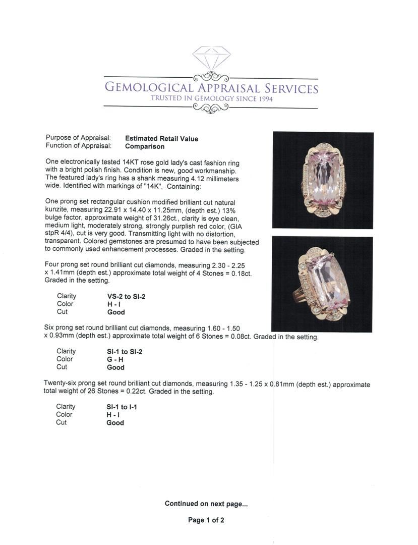One electronically tested 14KT rose gold lady's cast fashion ring with a bright polish finish. The featured lady's ring has a shank measuring 4.12 millimeters wide. Identified with markings of '14K'. Condition is new, good workmanship. Containing: One prong set rectangular cushion modified brilliant cut natural kunzite, measuring 22.91 x 14.40 x 11.25mm, (depth est.) 13%. bulge factor, approximate weight of 31.26ct., clarity is eye clean, medium light, moderately strong, strongly purplish red color, (GIA stpR 4/4), cut is very good. Transmitting light with no distortion, transparent. Colored gemstones are presumed to have been subjected to commonly used enhancement processes. Graded in the setting. Four prong set round brilliant cut diamonds, measuring 2.30 - 2.25 x 1.41mm (depth est.) approximate total weight of 4 Stones = 0.18ct. Graded in the setting. Clarity VS-2 to SI-2. Color: H - I Cut Good Six prong set round brilliant cut diamonds, measuring 1.60 - 1.50 x 0.93mm (depth est.) approximate total weight of 6 Stones = 0.08ct. Graded in the setting. Clarity SI-1 to SI-2. Color: G - H Cut Good Twenty-Six prong set round brilliant cut diamonds, measuring 1.35 - 1.25 x 0.81mm (depth est.) approximate total weight of 26 Stones = 0.22ct. Graded in the setting. Clarity SI-1 to I-1. Color: H - I Cut Good Six channel set baguette cut diamonds, measuring from 2.00 x 1.00 x 0.85mm (depth est.) to 2.30 x 1.20 x 1.02mm (depth est.) approximate total weight of 6 Stones = 0.12ct. Graded in the setting. Clarity VS-2 to SI-1. Color: H - I Cut Good. Total Weight of Colored Stones 31.26ct.. Total Weight of Diamonds 0.60ct.. Total Weight of Ring 16.40gm. GAS Appraised at $13,375.00.
