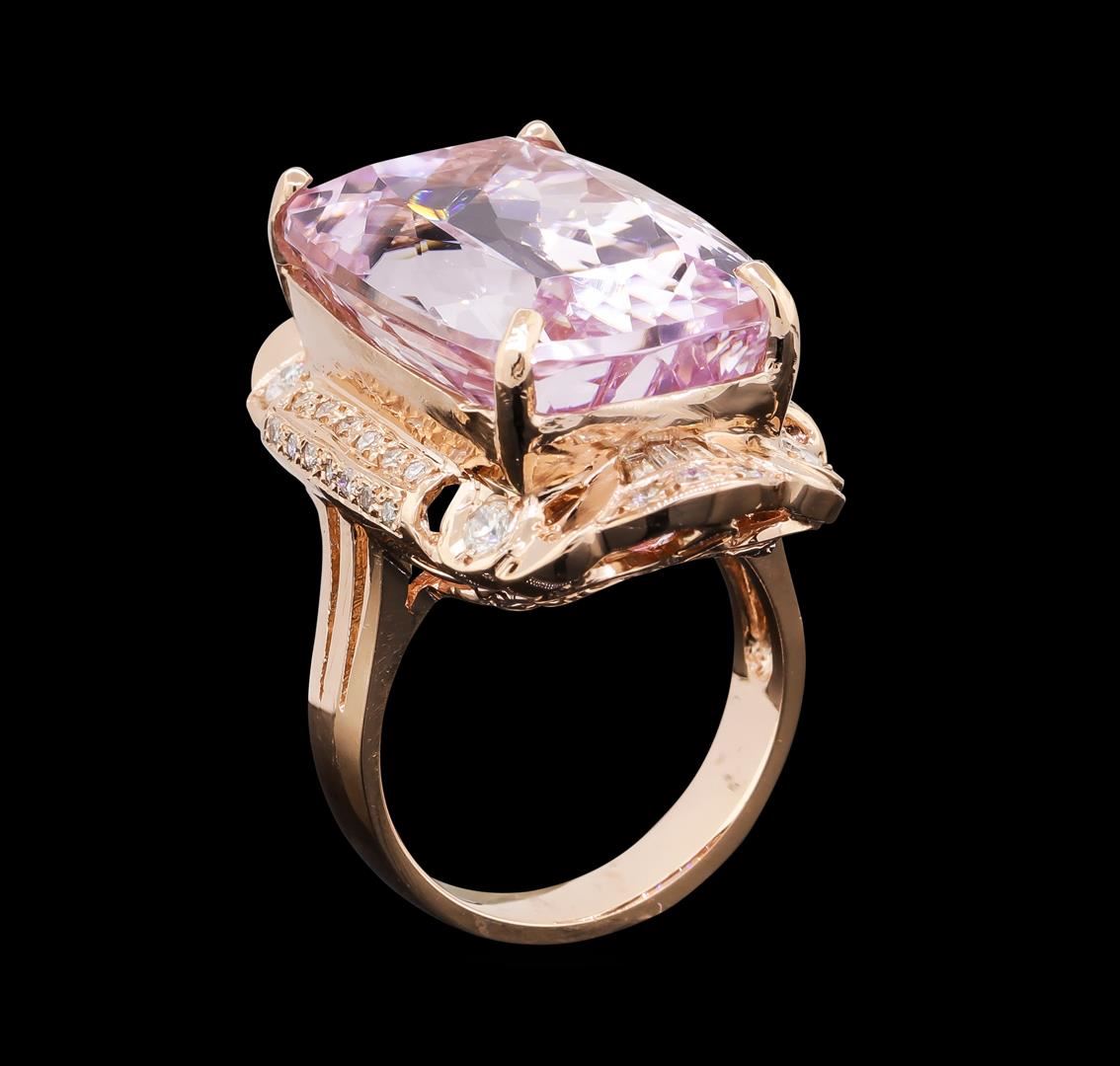 One electronically tested 14KT rose gold lady's cast fashion ring with a bright polish finish. The featured lady's ring has a shank measuring 4.12 millimeters wide. Identified with markings of '14K'. Condition is new, good workmanship. Containing: One prong set rectangular cushion modified brilliant cut natural kunzite, measuring 22.91 x 14.40 x 11.25mm, (depth est.) 13%. bulge factor, approximate weight of 31.26ct., clarity is eye clean, medium light, moderately strong, strongly purplish red color, (GIA stpR 4/4), cut is very good. Transmitting light with no distortion, transparent. Colored gemstones are presumed to have been subjected to commonly used enhancement processes. Graded in the setting. Four prong set round brilliant cut diamonds, measuring 2.30 - 2.25 x 1.41mm (depth est.) approximate total weight of 4 Stones = 0.18ct. Graded in the setting. Clarity VS-2 to SI-2. Color: H - I Cut Good Six prong set round brilliant cut diamonds, measuring 1.60 - 1.50 x 0.93mm (depth est.) approximate total weight of 6 Stones = 0.08ct. Graded in the setting. Clarity SI-1 to SI-2. Color: G - H Cut Good Twenty-Six prong set round brilliant cut diamonds, measuring 1.35 - 1.25 x 0.81mm (depth est.) approximate total weight of 26 Stones = 0.22ct. Graded in the setting. Clarity SI-1 to I-1. Color: H - I Cut Good Six channel set baguette cut diamonds, measuring from 2.00 x 1.00 x 0.85mm (depth est.) to 2.30 x 1.20 x 1.02mm (depth est.) approximate total weight of 6 Stones = 0.12ct. Graded in the setting. Clarity VS-2 to SI-1. Color: H - I Cut Good. Total Weight of Colored Stones 31.26ct.. Total Weight of Diamonds 0.60ct.. Total Weight of Ring 16.40gm. GAS Appraised at $13,375.00.