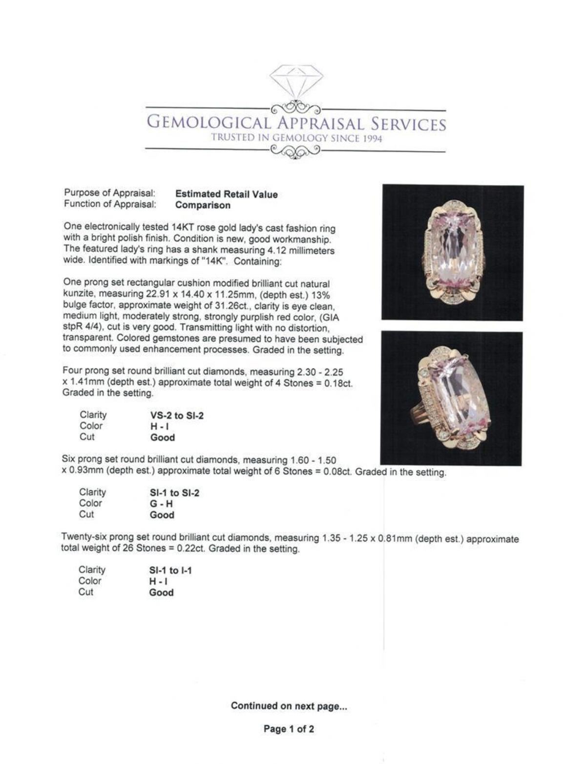 One electronically tested 14KT rose gold lady's cast fashion ring with a bright polish finish. The featured lady's ring has a shank measuring 4.12 millimeters wide. Identified with markings of '14K'. Condition is new, good workmanship. Containing: One prong set rectangular cushion modified brilliant cut natural kunzite, measuring 22.91 x 14.40 x 11.25mm, (depth est.) 13%. bulge factor, approximate weight of 31.26ct., clarity is eye clean, medium light, moderately strong, strongly purplish red color, (GIA stpR 4/4), cut is very good. Transmitting light with no distortion, transparent. Colored gemstones are presumed to have been subjected to commonly used enhancement processes. Graded in the setting. Four prong set round brilliant cut diamonds, measuring 2.30 - 2.25 x 1.41mm (depth est.) approximate total weight of 4 Stones = 0.18ct. Graded in the setting. Clarity VS-2 to SI-2. Color: H - I Cut Good Six prong set round brilliant cut diamonds, measuring 1.60 - 1.50 x 0.93mm (depth est.) approximate total weight of 6 Stones = 0.08ct. Graded in the setting. Clarity SI-1 to SI-2. Color: G - H Cut Good Twenty-Six prong set round brilliant cut diamonds, measuring 1.35 - 1.25 x 0.81mm (depth est.) approximate total weight of 26 Stones = 0.22ct. Graded in the setting. Clarity SI-1 to I-1. Color: H - I Cut Good Six channel set baguette cut diamonds, measuring from 2.00 x 1.00 x 0.85mm (depth est.) to 2.30 x 1.20 x 1.02mm (depth est.) approximate total weight of 6 Stones = 0.12ct. Graded in the setting. Clarity VS-2 to SI-1. Color: H - I Cut Good. Total Weight of Colored Stones 31.26ct.. Total Weight of Diamonds 0.60ct.. Total Weight of Ring 16.40gm. GAS Appraised.