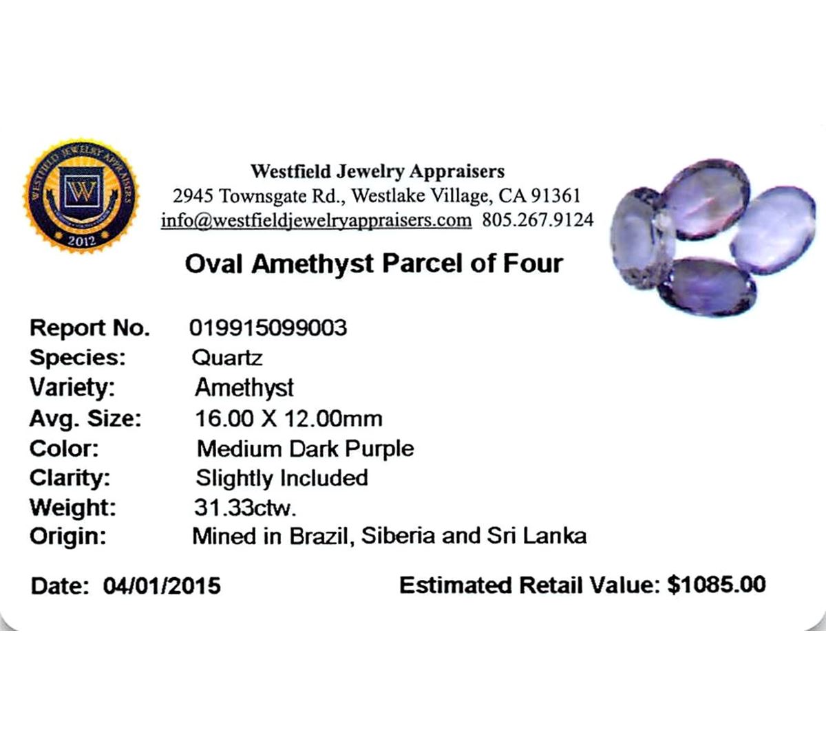 Four oval mixed cut natural amethysts exact total weight 31.33ct., clarity is slightly included, type II, medium dark, very slightly grayish, purple color, (GIA P 6/3), cut is good. Westfield Appraised at $1,085.00.